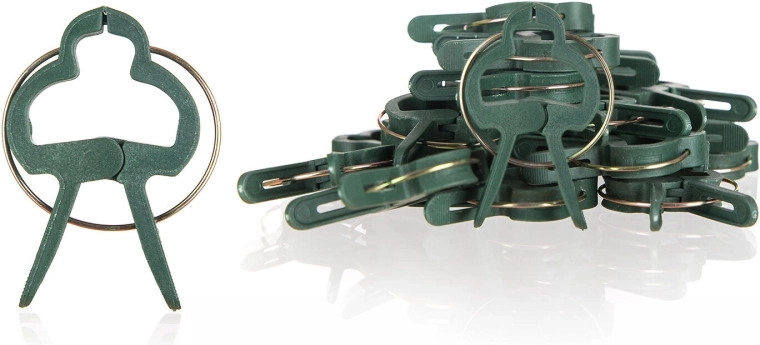 De clips zijn gemaakt van duurzaam kunststof met een metalen veer, zodat ze herhaald gebruik gedurende het hele seizoen doorstaan. Ideaal voor tomaten, paprika’s, komkommers, kruiden en kamerklimplanten.