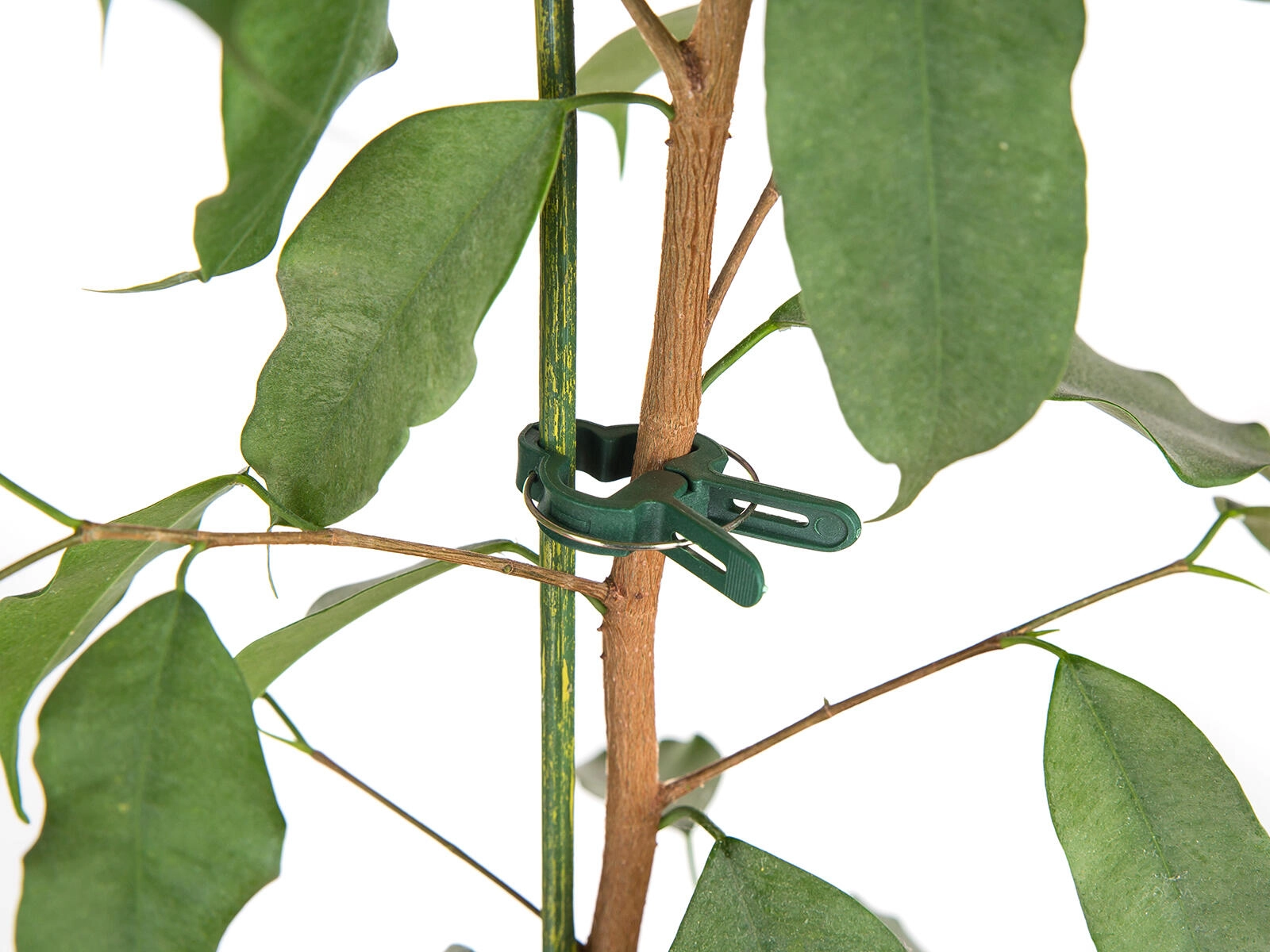 De veerclip houdt stengels veilig tegen de steun zonder te beschadigen of te breken. Perfect voor gevoelige jonge planten en stevigere scheuten.
