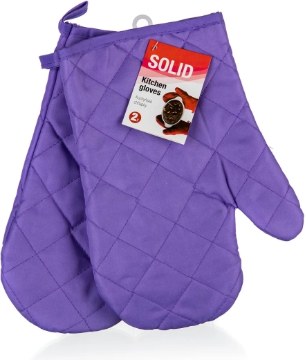 Praktische set SOLID ovenwanten in formaat 27 × 17 cm beschermt je handen betrouwbaar bij het hanteren van heet servies en pannen. Duurzame polyester, een comfortabele pasvorm en dik doorgestikt padding zorgen voor uitstekende thermische isolatie. Elke want heeft een ophanglus voor eenvoudig opbergen. Geleverd als een paar (2 stuks) in een kleurenmix.