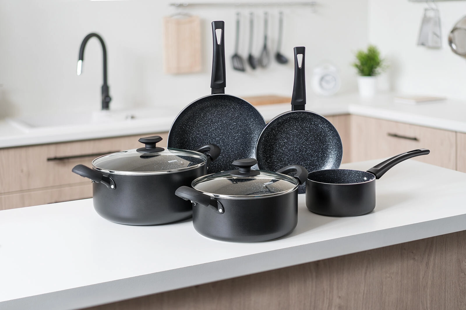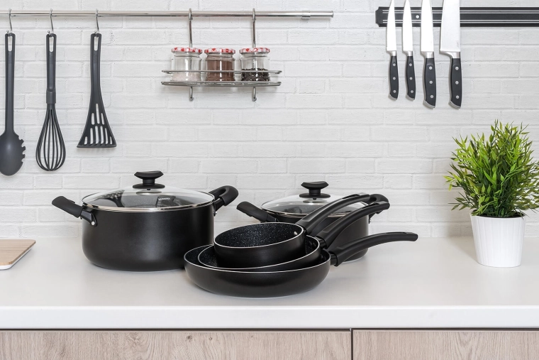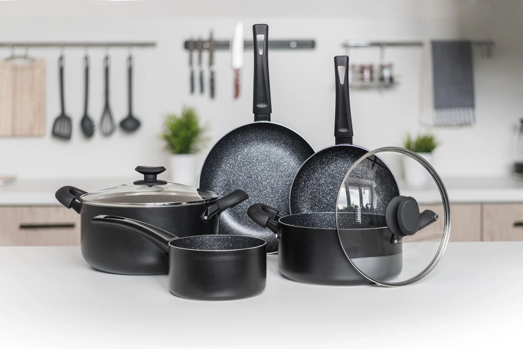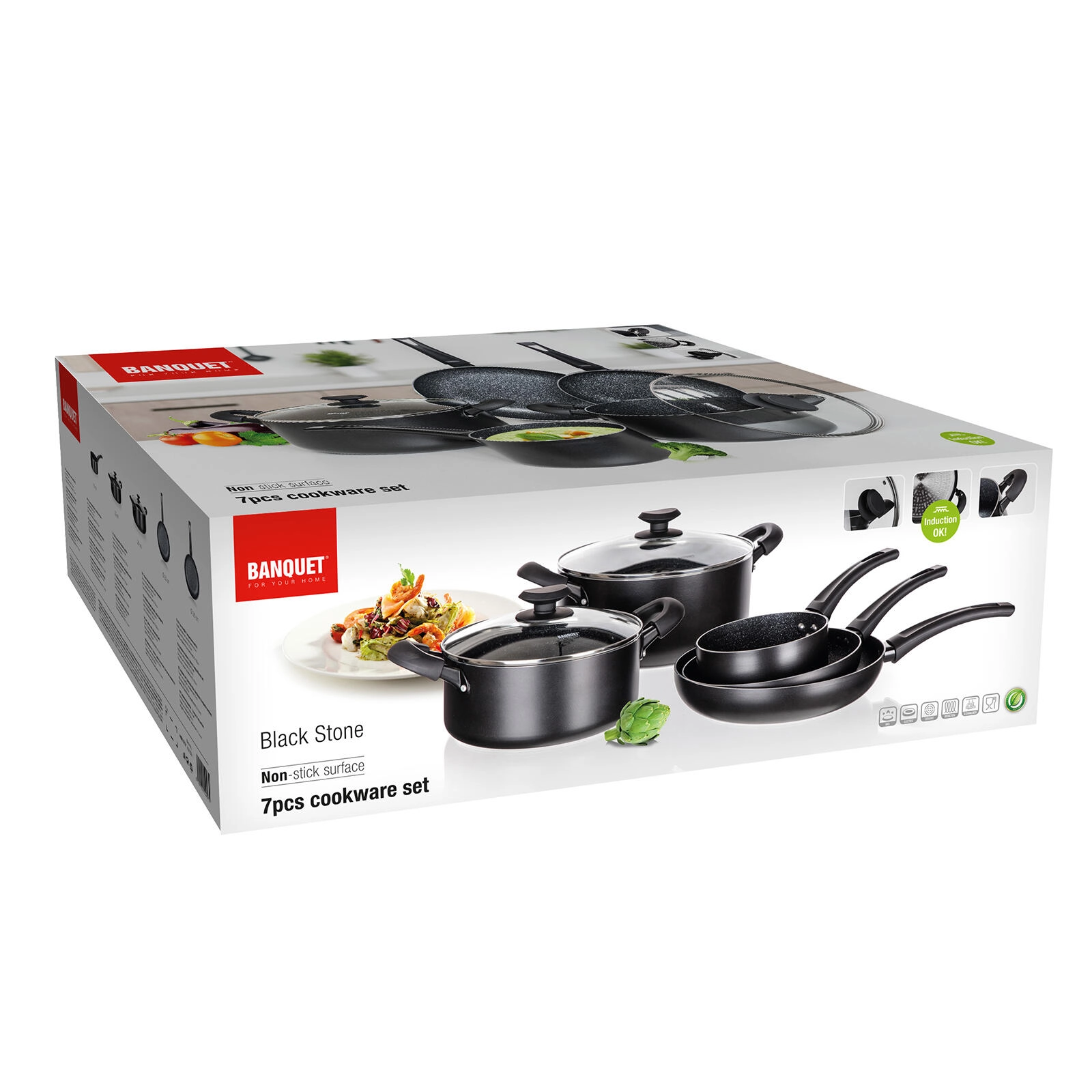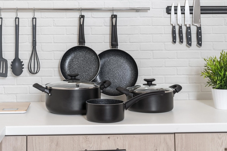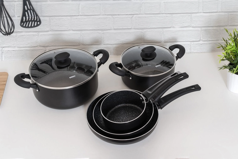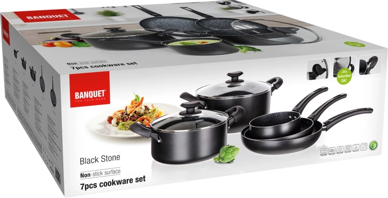 De BLACK STONE pannenset in elegant zwart dekt het dagelijks koken van snel roerbakken tot langzaam stoven. Gegoten aluminium met hoge warmtegeleiding warmt snel op en houdt de temperatuur lang vast, zodat u sneller en energiezuiniger kookt. De zeer duurzame antiaanbaklaag zorgt voor gemakkelijk loskomen van gerechten en eenvoudige reiniging.