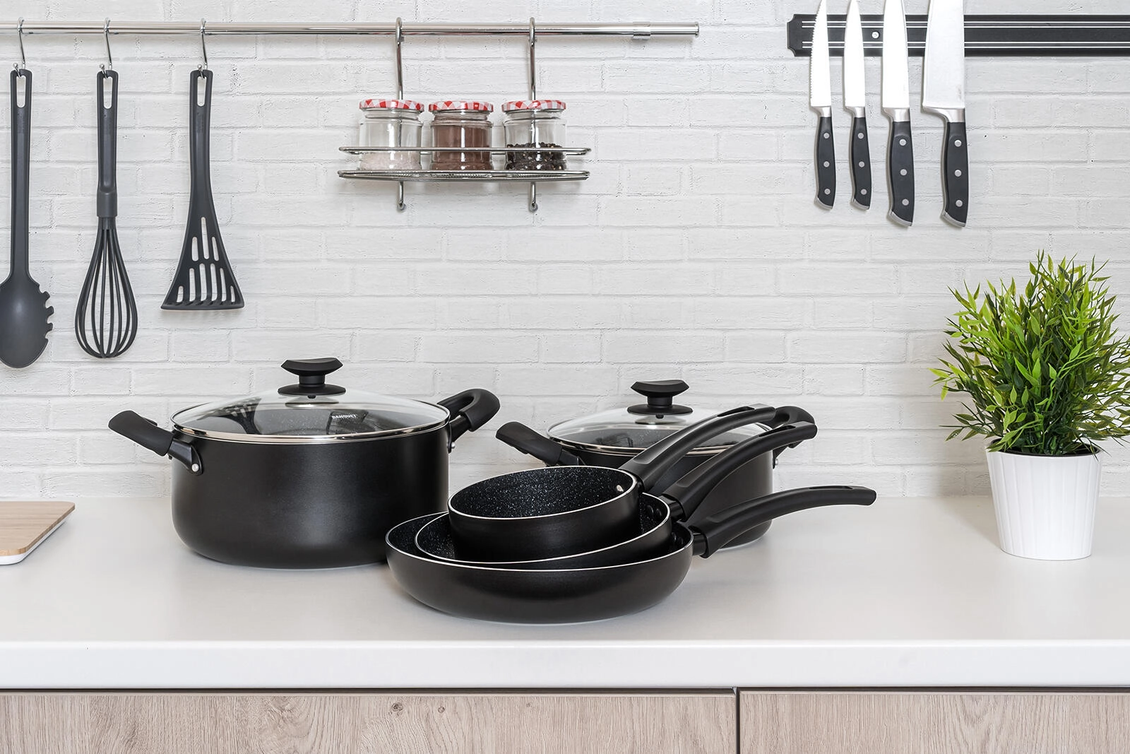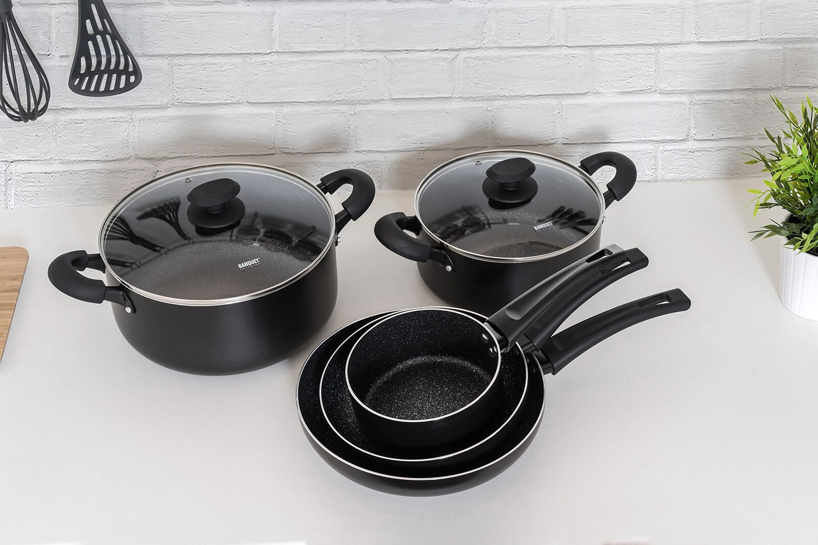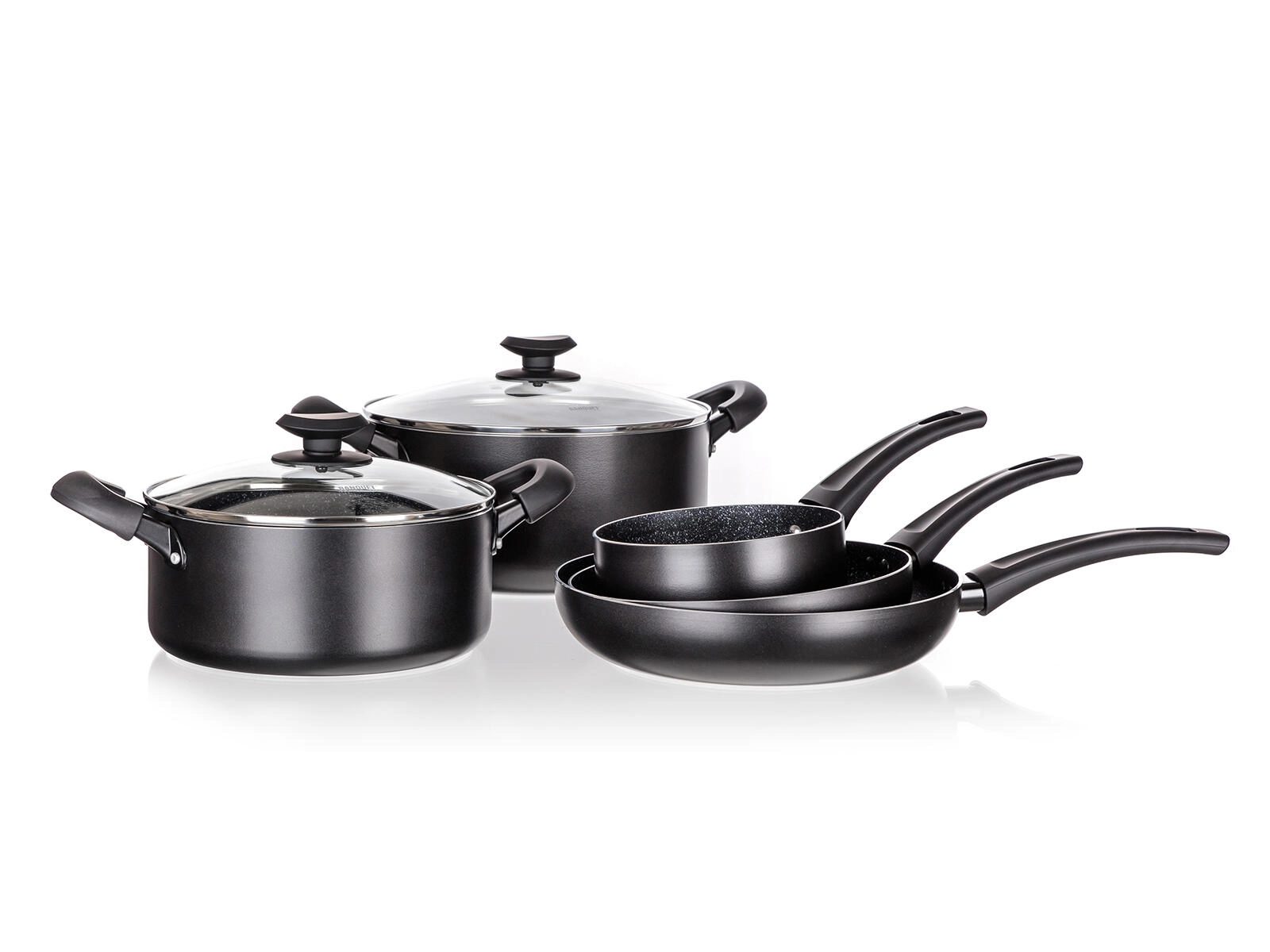 Universele 7-delige pannenset voor elke dag met een duurzame antiaanbaklaag, volledig inductiebodem en ergonomische soft-touch handgrepen. Gegoten aluminium zorgt voor een snelle warmteverdeling; de pannen zijn bestand tegen krassen, stoten en vervorming en met de transparante glazen deksels houdt u het kookproces altijd onder controle.