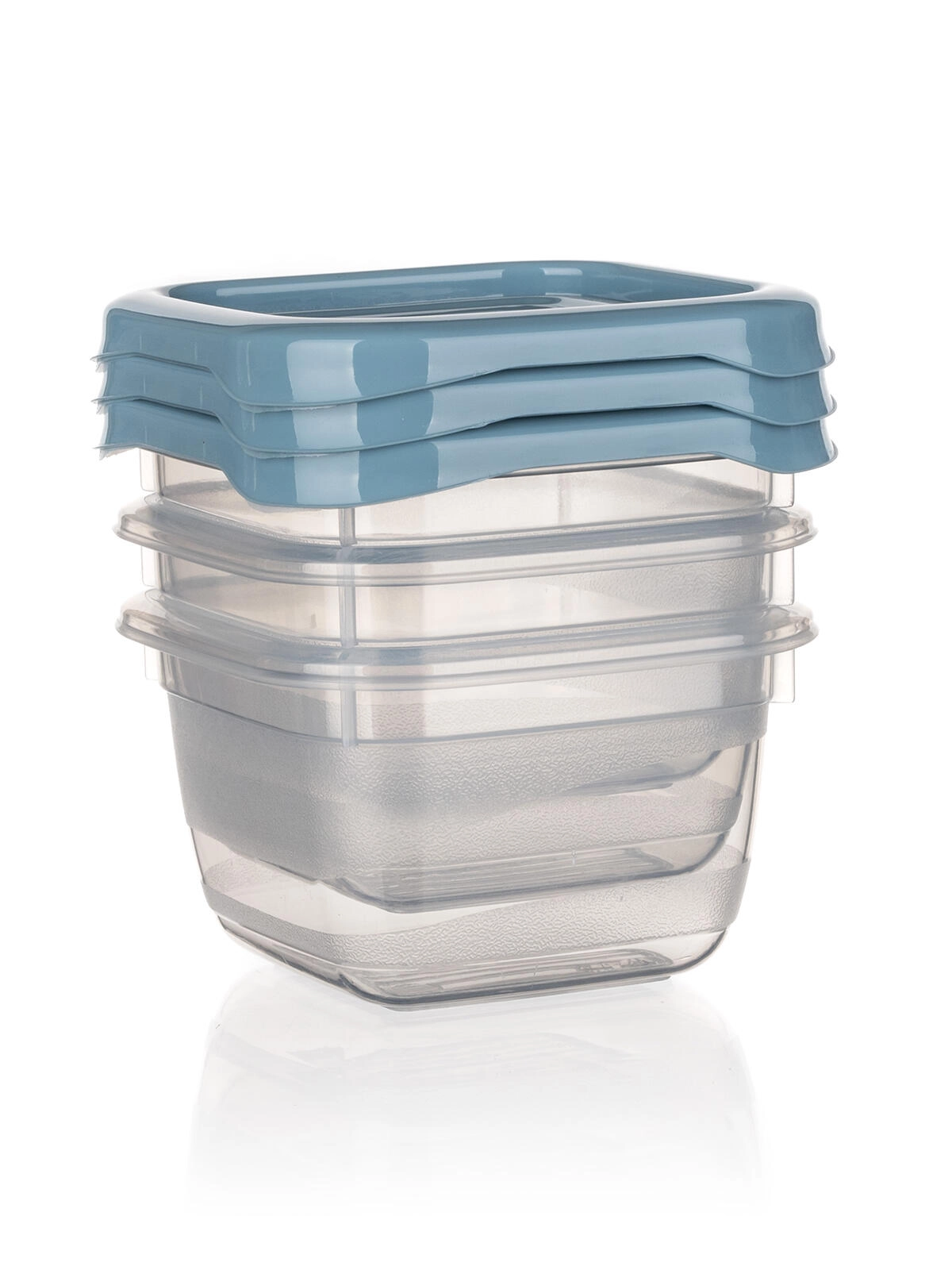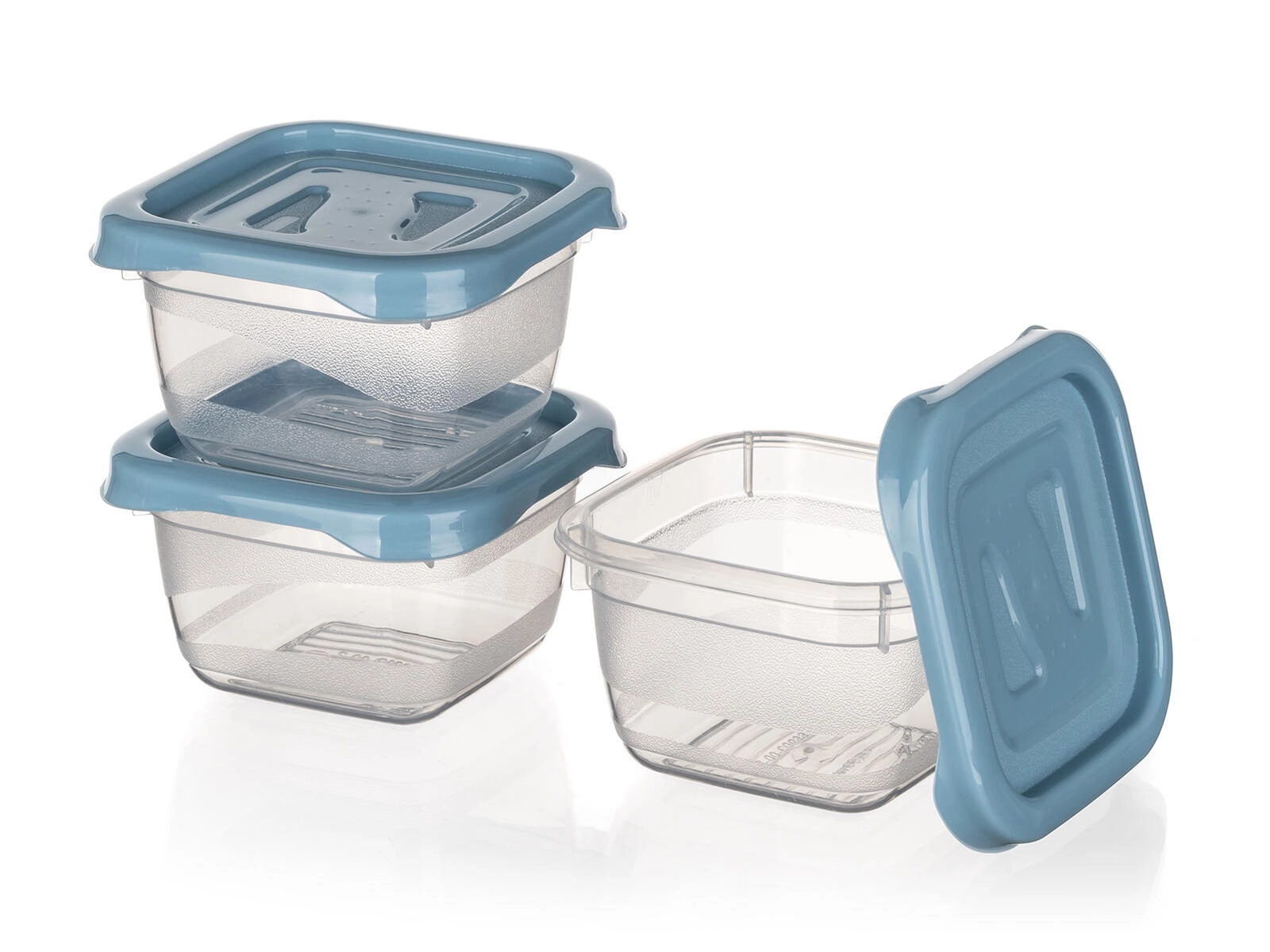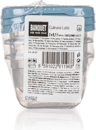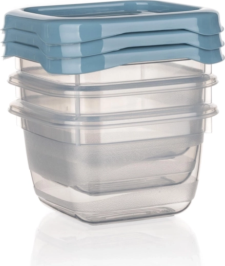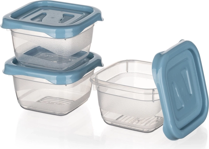 Compacte set van drie vierkante CULINARIA-bakjes met een inhoud van 0,1 l, ideaal voor het bewaren van kleine porties, dressings en snacks. Praktische deksels in de tint nordic blue sluiten goed af, de bakjes zijn geschikt voor vaatwasser, magnetron en vriezer en dankzij het transparante kunststof zie je de inhoud in één oogopslag.
