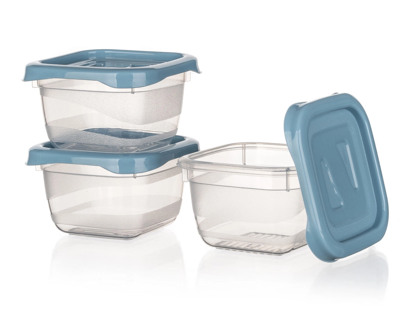 Stevige deksels in de kleur nordic blue sluiten goed aan en helpen de versheid te bewaren en lekken te voorkomen.