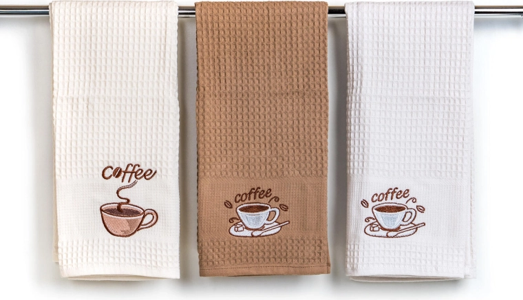 De decoratieve COFFEE-borduursels geven de keuken extra flair. De set van drie stuks in wit, crème en beige past in elk interieur.