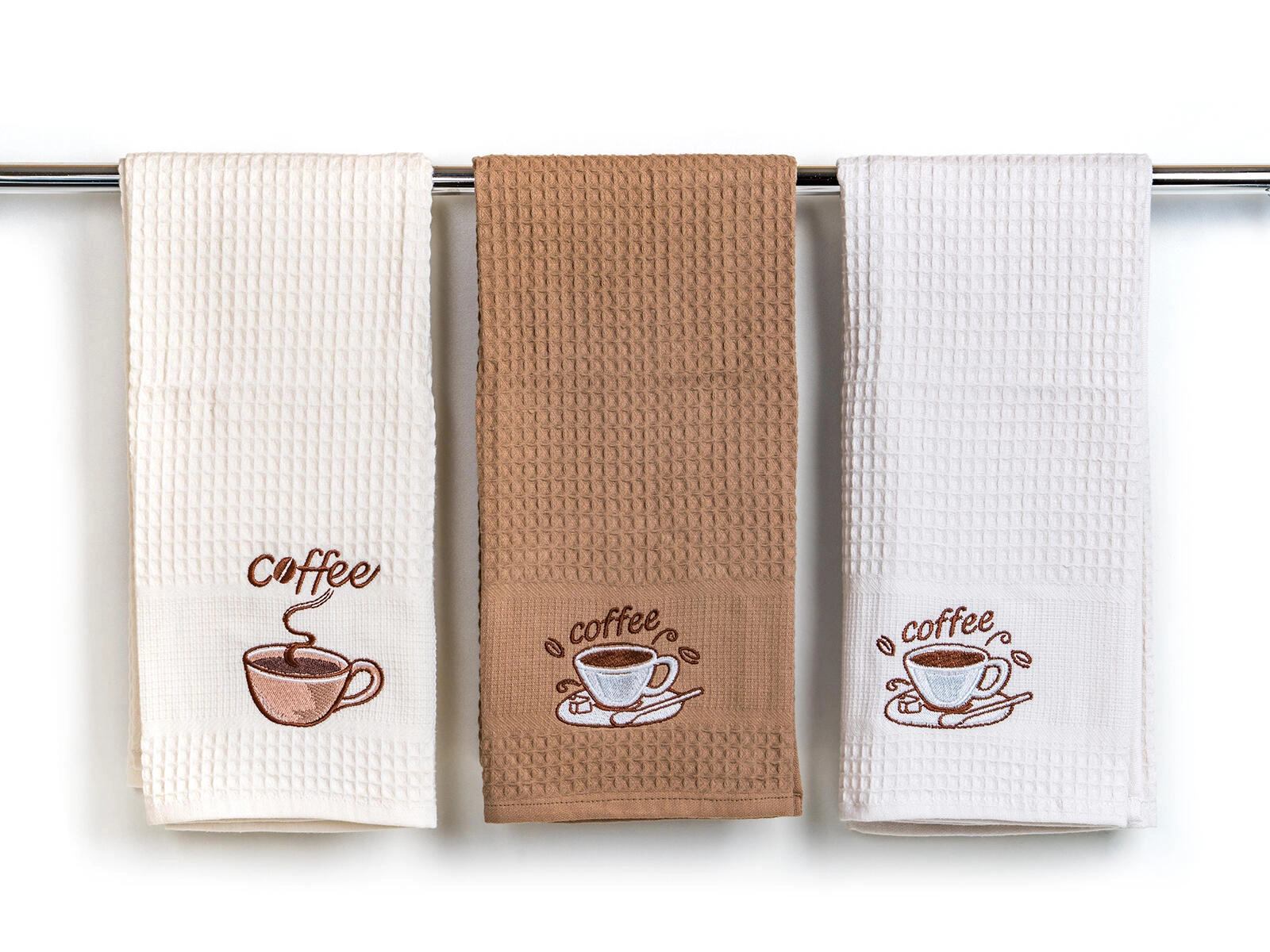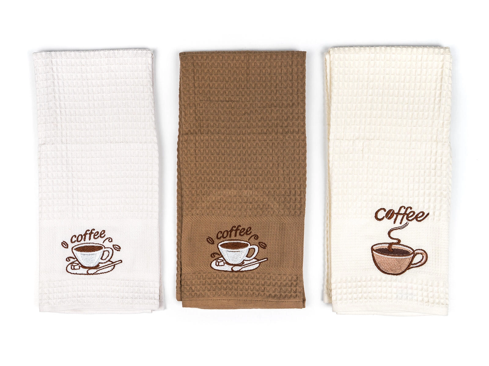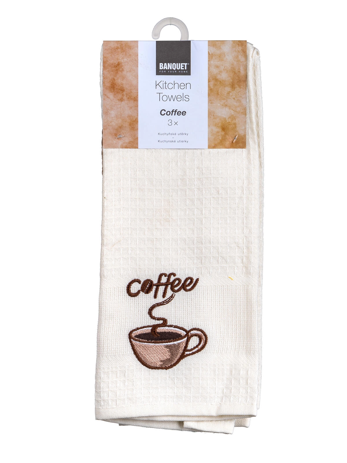 Stijlvolle en praktische keukenhanddoeken met het motief COFFEE, uitblinker dankzij de wafelstructuur voor uitstekende absorptie en snel drogen. Gemaakt van 100% katoen, in een mix van neutrale kleuren (wit, crème, beige), ideaal voor dagelijks gebruik in de keuken en een mooie aanvulling op het interieur.