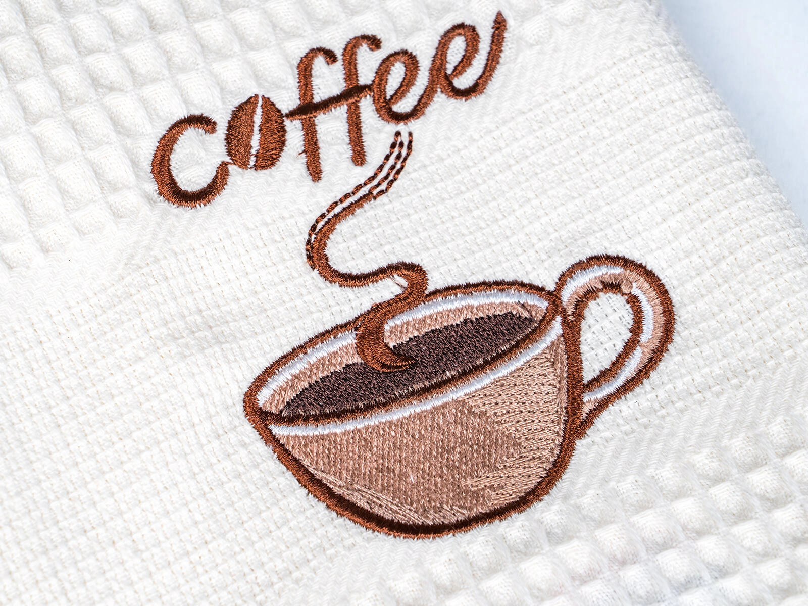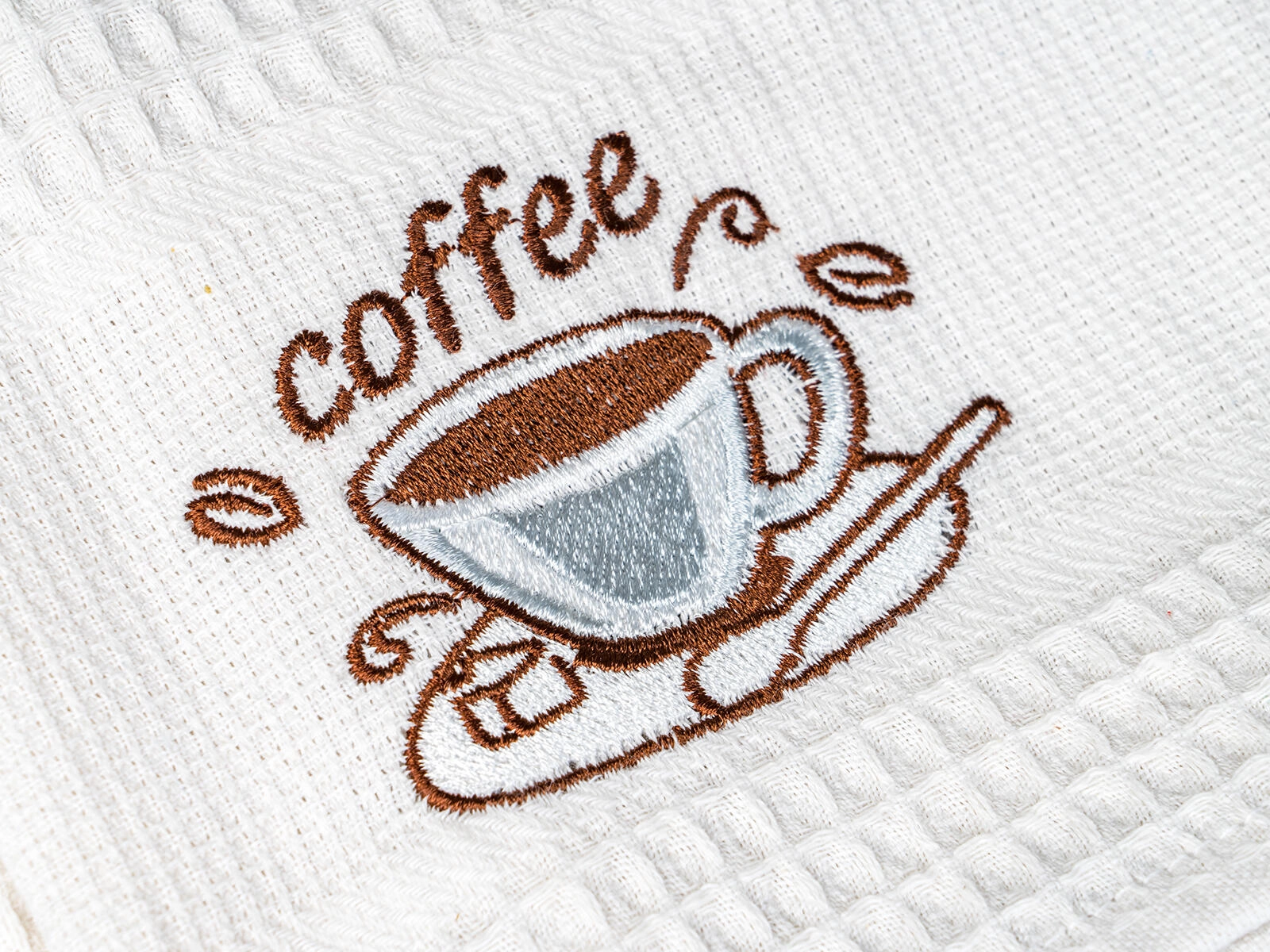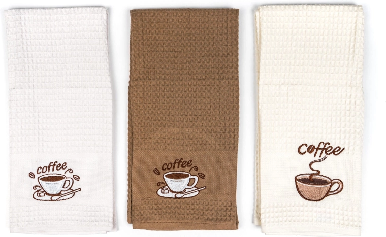 Stijlvolle en praktische keukenhanddoeken met het motief COFFEE, uitblinker dankzij de wafelstructuur voor uitstekende absorptie en snel drogen. Gemaakt van 100% katoen, in een mix van neutrale kleuren (wit, crème, beige), ideaal voor dagelijks gebruik in de keuken en een mooie aanvulling op het interieur.