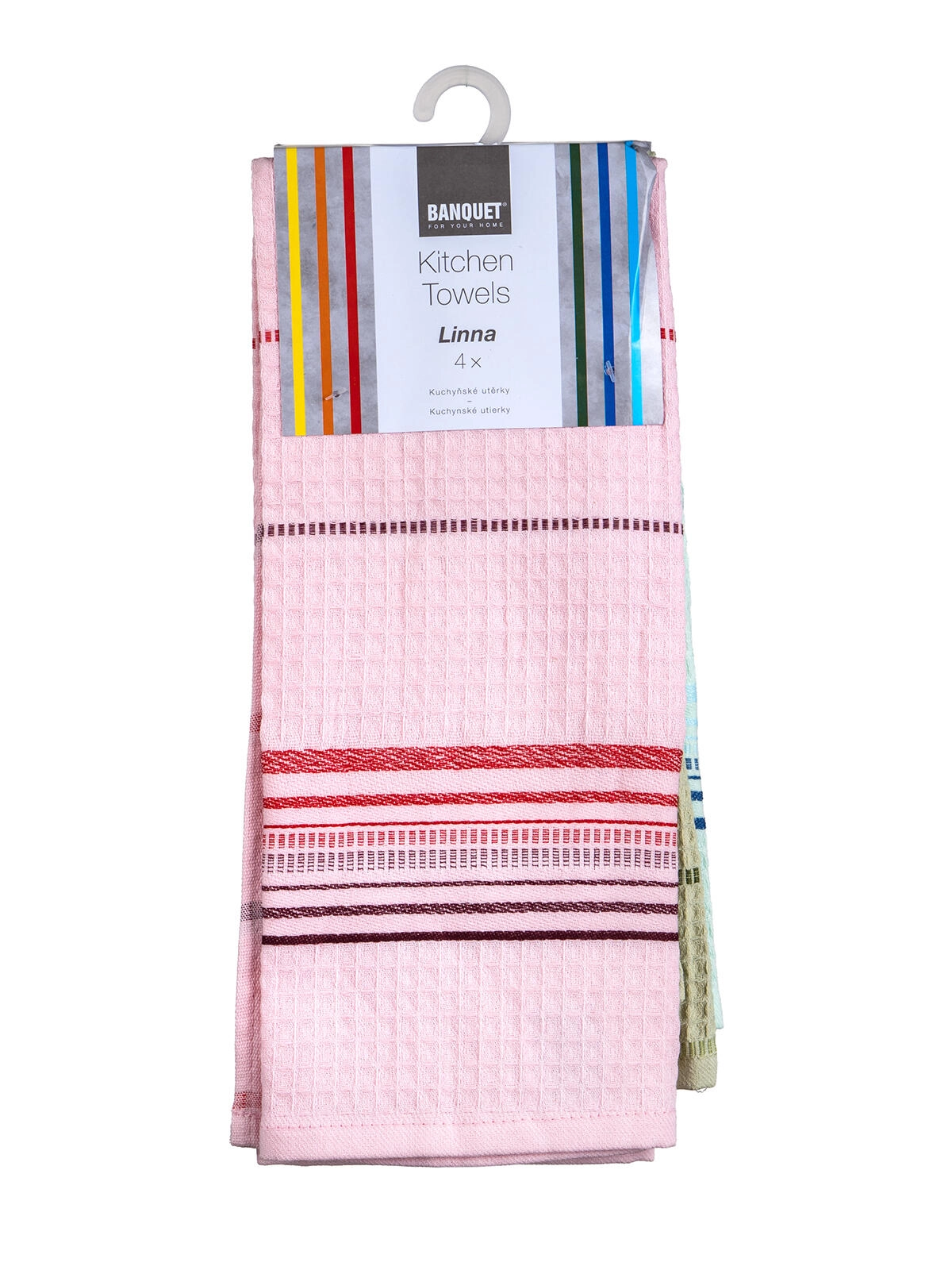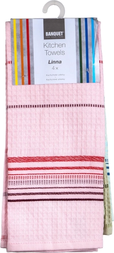 De praktische set LINNA keukendoeken van 100% katoen biedt uitstekende absorptie en duurzaamheid voor dagelijks gebruik. De wafelstructuur met een meerkleurige ingeweven boord droogt snel, voelt prettig aan en geeft je keuken een frisse uitstraling. De verpakking bevat 4 stuks in een mix van kleuren (wit, roze, blauw, groen) met een formaat van 40 × 60 cm.