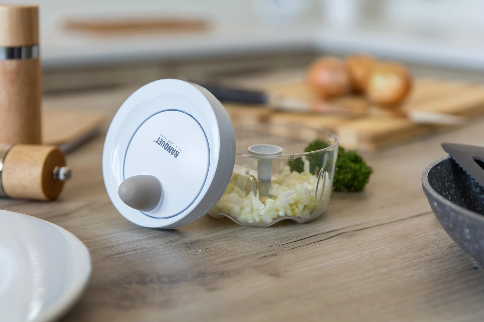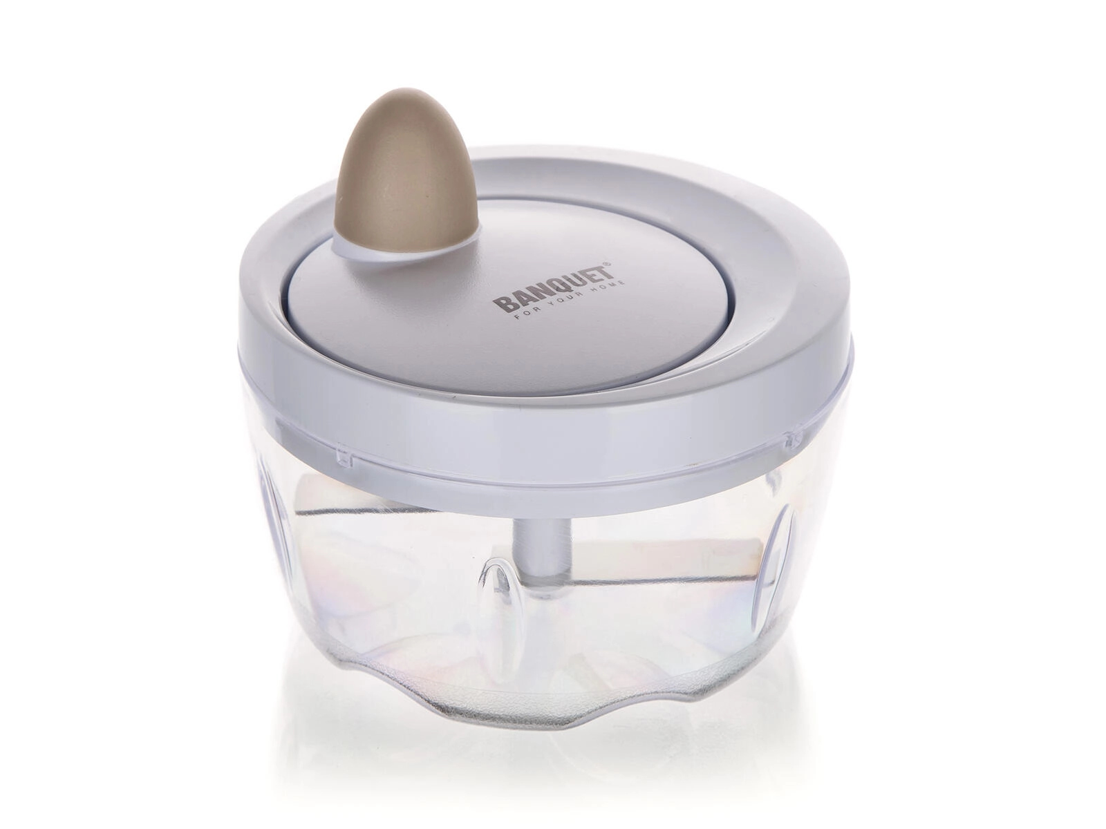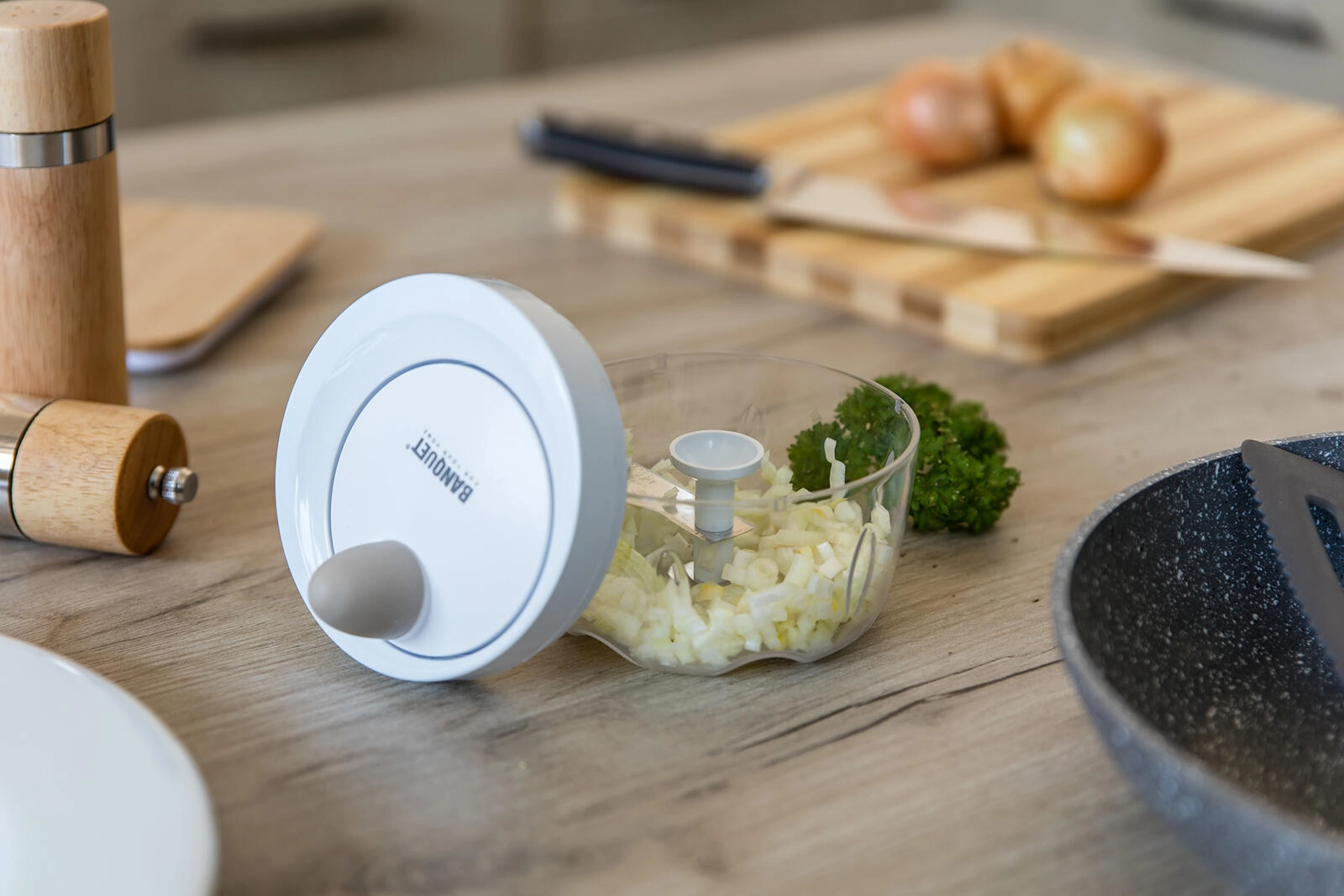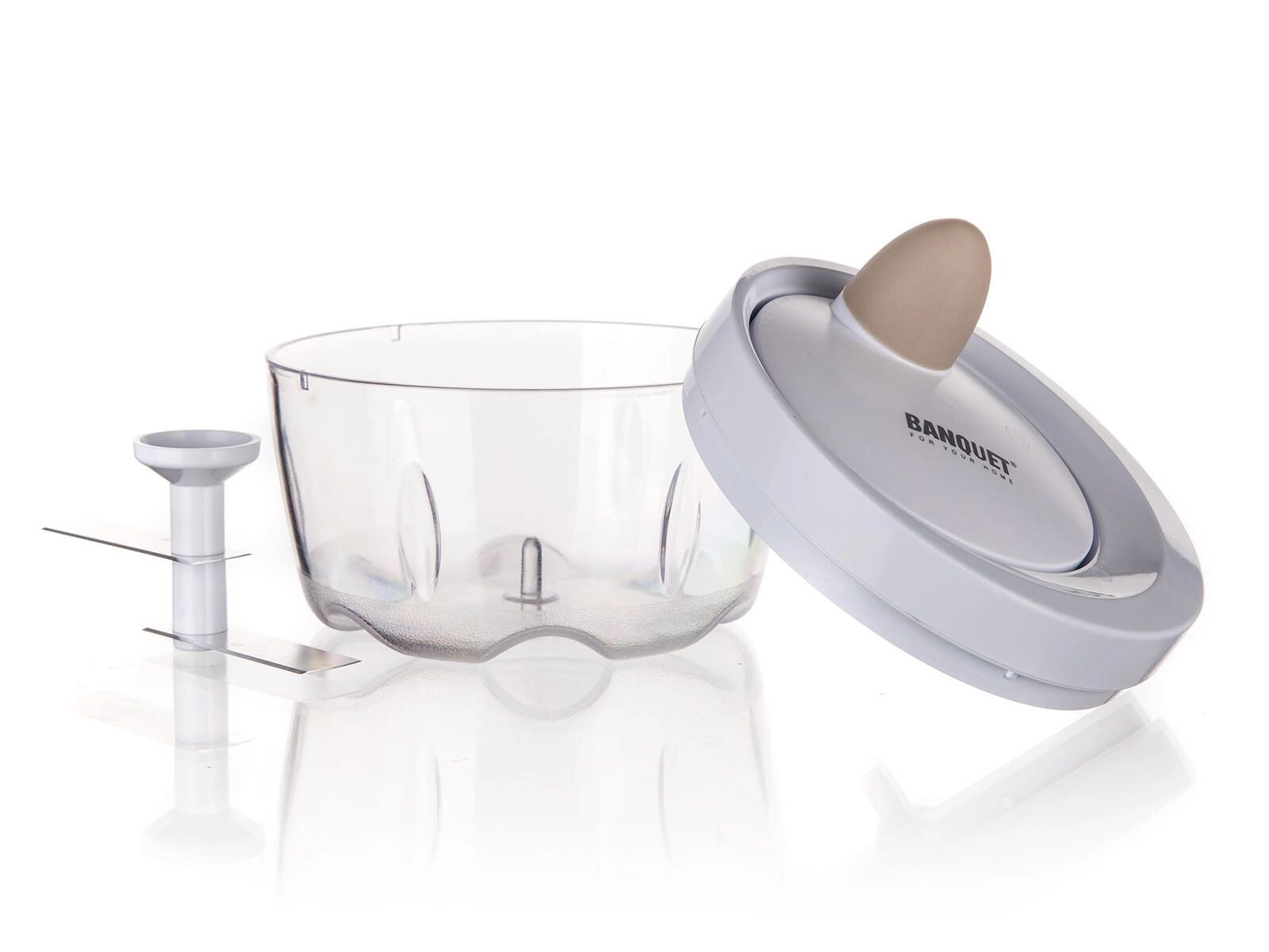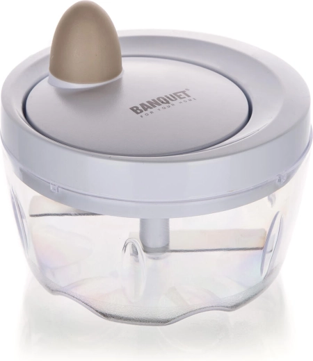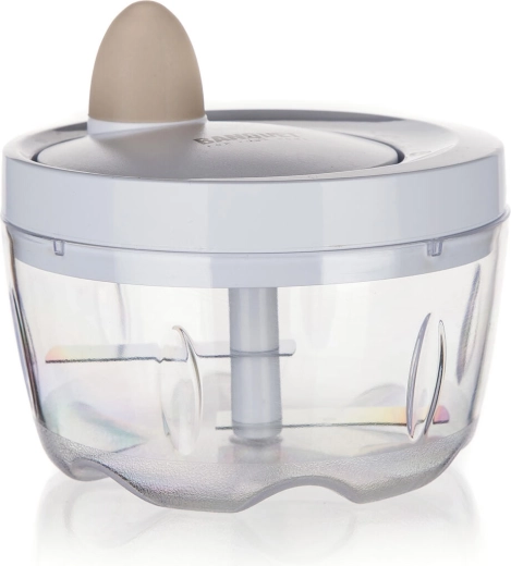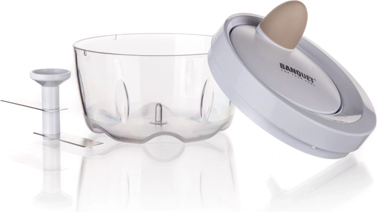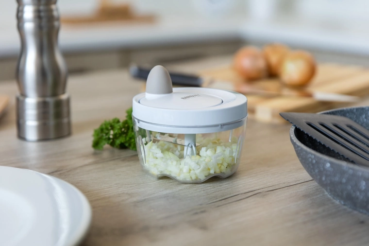 De mechanische aandrijving met trekkoord laat de roestvrijstalen messen binnen enkele seconden ronddraaien. Ideaal voor uien, kruiden en fruit.