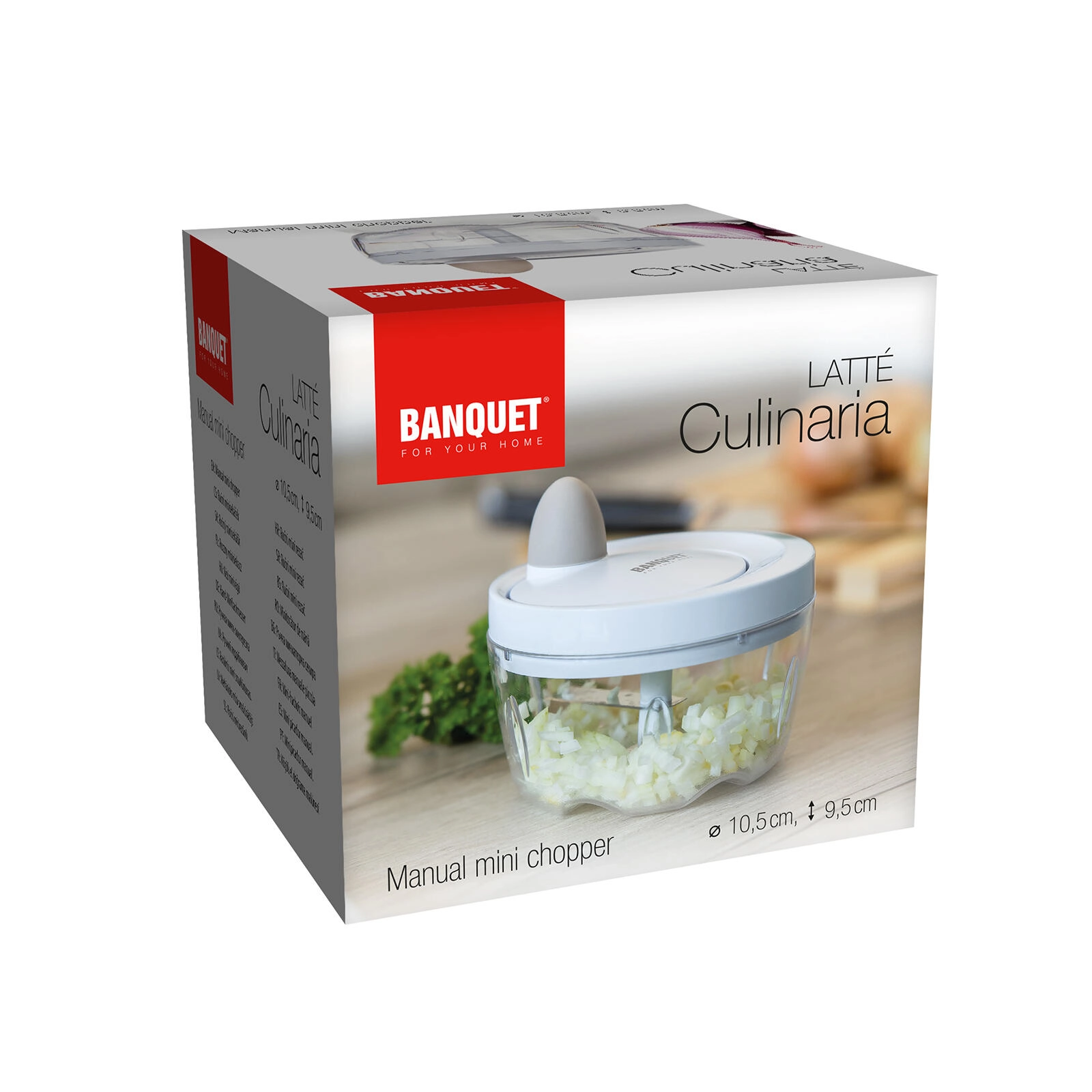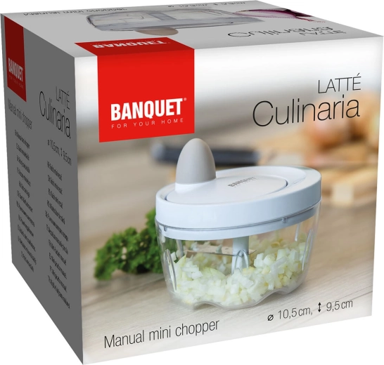 De praktische minihakmolen Culinaria Latte is een ideale hulp in elke keuken. Dankzij de scherpe roestvrijstalen messen hakt hij uien, kruiden, noten en groenten gemakkelijk en gelijkmatig. De transparante kom met een diameter van 10,5 cm maakt het mogelijk de consistentie in real time te controleren.
