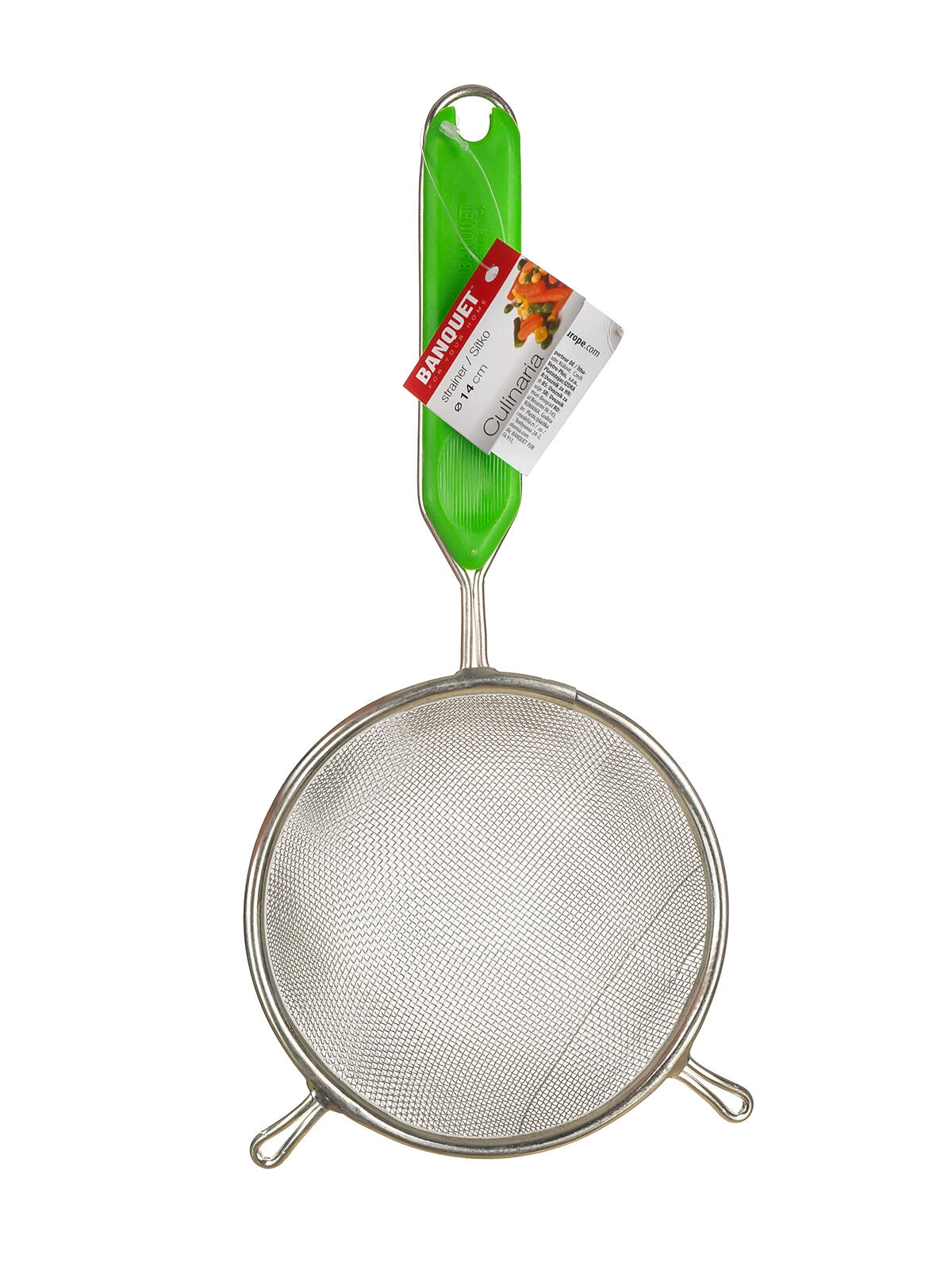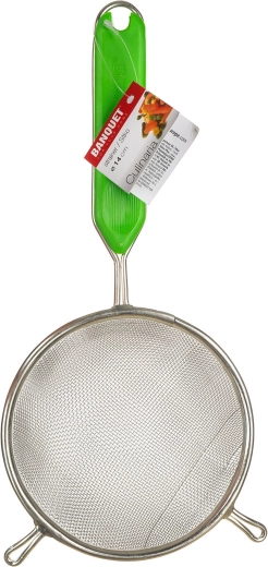 Praktische keukenzeef met een diameter van 14 cm van vertind metaal met een stevige ABS-kunststof inleg in de handgreep voor comfortabel vasthouden. Fijn gaas 1 × 1 mm met een dichtheid van 15 mazen per cm² vangt betrouwbaar zelfs kleine onzuiverheden op. Ideaal voor het zeven van vloeistoffen en dranken, sauzen of bouillons, in een elegante groene kleur.