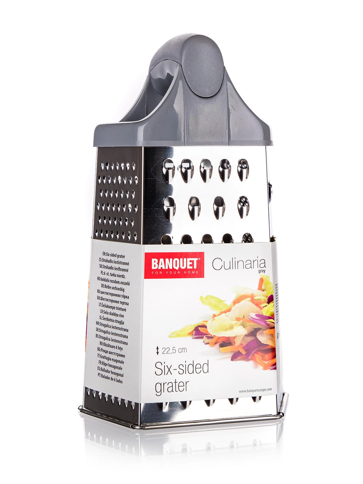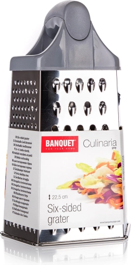 Ontdek de veelzijdige hulp in de keuken – de zeskantige roestvrijstalen rasp CULINARIA Grey met een hoogte van 22,5 cm. Biedt diverse snijvlakken voor fijn en grof raspen, snijden en schaven, waardoor hij geschikt is voor kaas, groenten, fruit en chocolade. Dankzij de stevige constructie is hij stabiel tijdens het werk en eenvoudig te onderhouden.