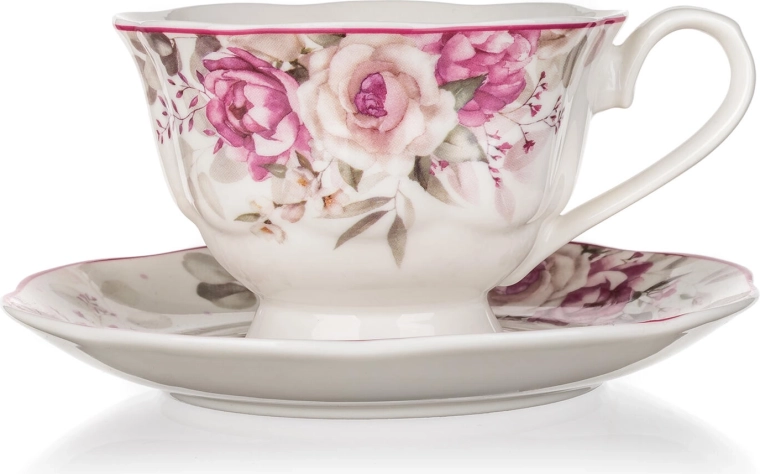 Elegante kop met schotel ROSE met een inhoud van 220 ml van hoogwaardige keramiek, ideaal voor zowel dagelijks als feestelijk serveren van koffie en thee. Het subtiele bloemmotief met rozen geeft de tafel een romantische toets, terwijl de praktische eigenschappen – vaatwasmachinebestendig en geschikt voor de magnetron – zorgen voor eenvoudig gebruik en onderhoud.