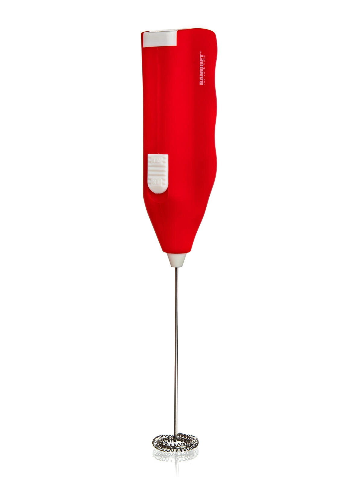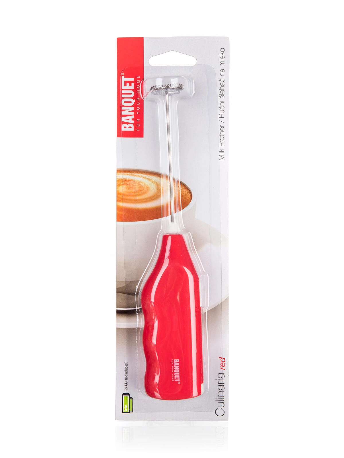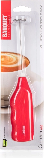 Praktische handmatige melkopschuimer Culinaria Red voor het snel bereiden van romig schuim voor koffie, cappuccino of warme chocolademelk. De combinatie van een roestvrijstalen klopgedeelte en een ergonomisch kunststof handvat blinkt uit in eenvoudige bediening en duurzaamheid. Aangedreven door 2× AA-batterijen (niet inbegrepen), zodat je overal zonder kabels van schuim kunt genieten.