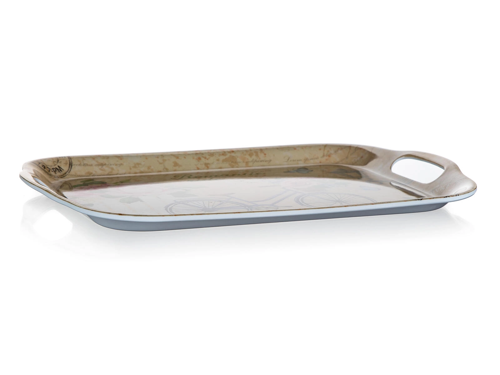 Elegant serveerblad met vintage print van bloemen, vlinders en een fiets is een praktische hulp in elk huishouden. Melaminehars zorgt voor hoge duurzaamheid en tegelijkertijd een laag gewicht, zodat het dienblad gemakkelijk te hanteren is bij dagelijks gebruik.