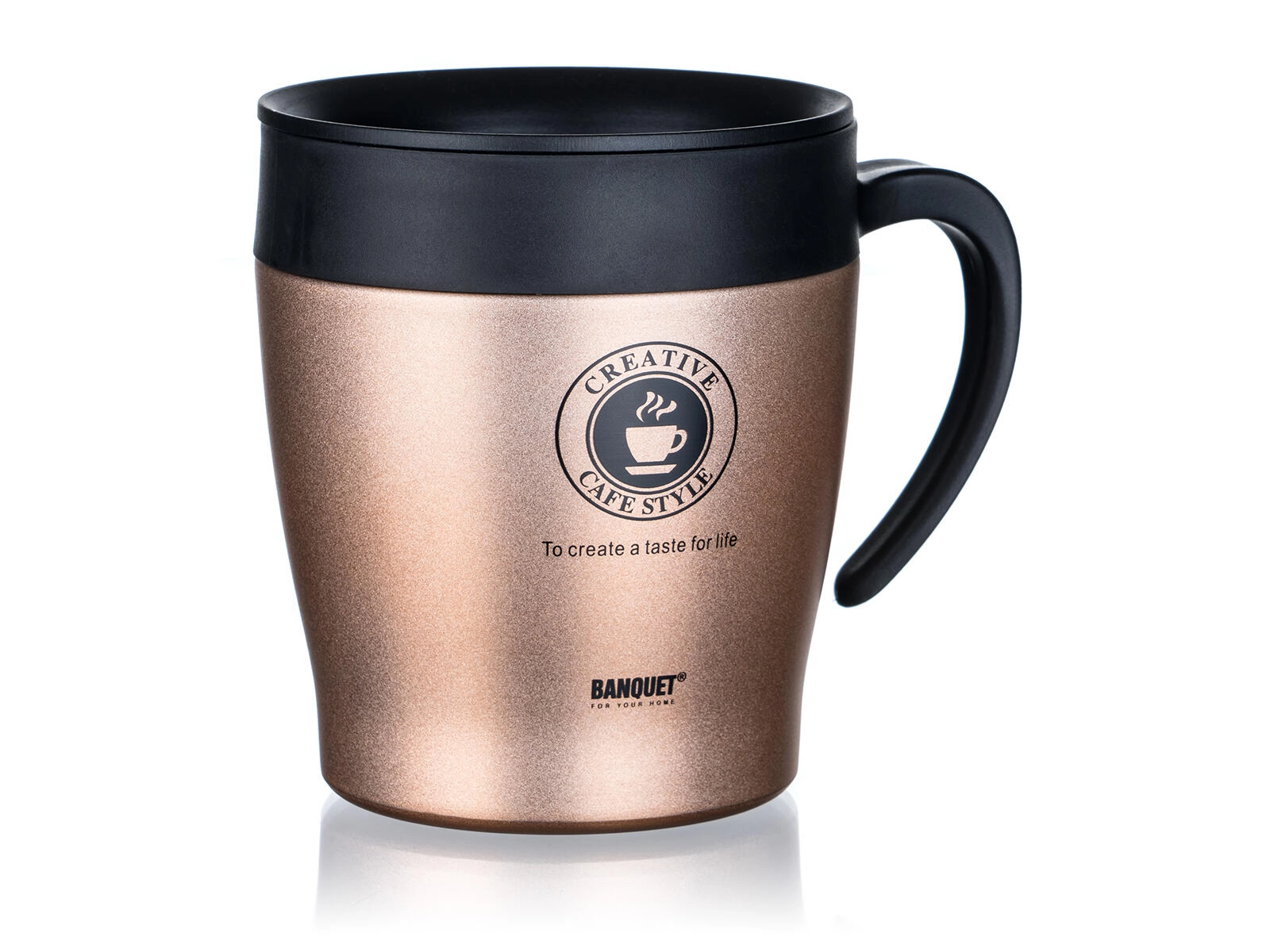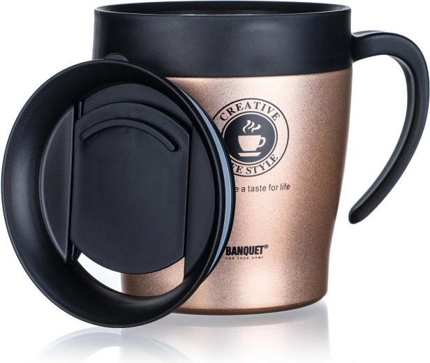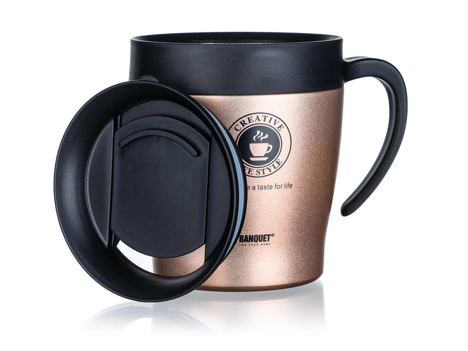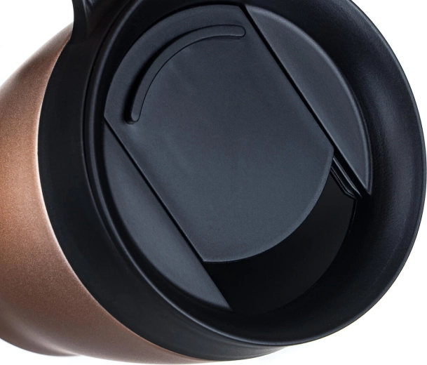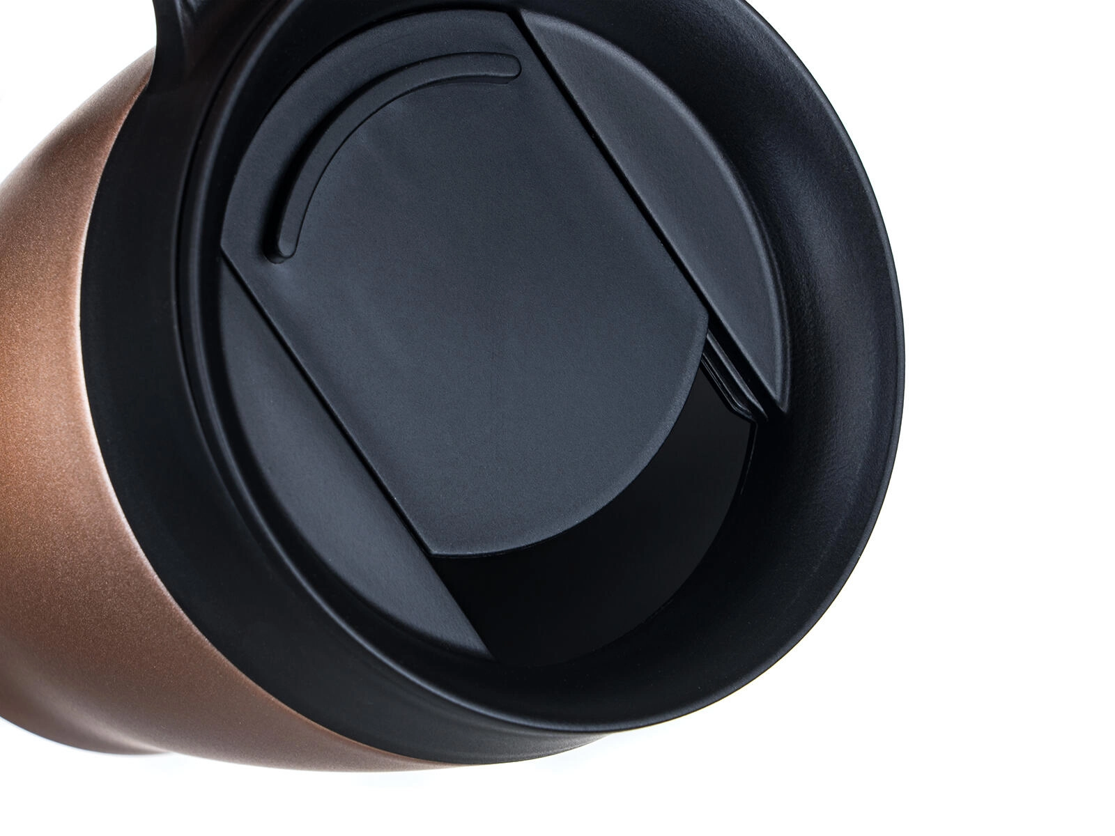 Het bruine metallic design oogt elegant en dankzij het comfortabele oor ligt de beker goed in de hand. Met een inhoud van 330 ml is hij perfect voor kantoor, auto en reizen. Voor maximaal comfort raden we aan de beker rechtop te vervoeren; het deksel is niet volledig lekvrij.