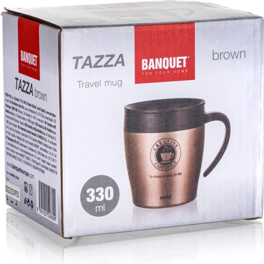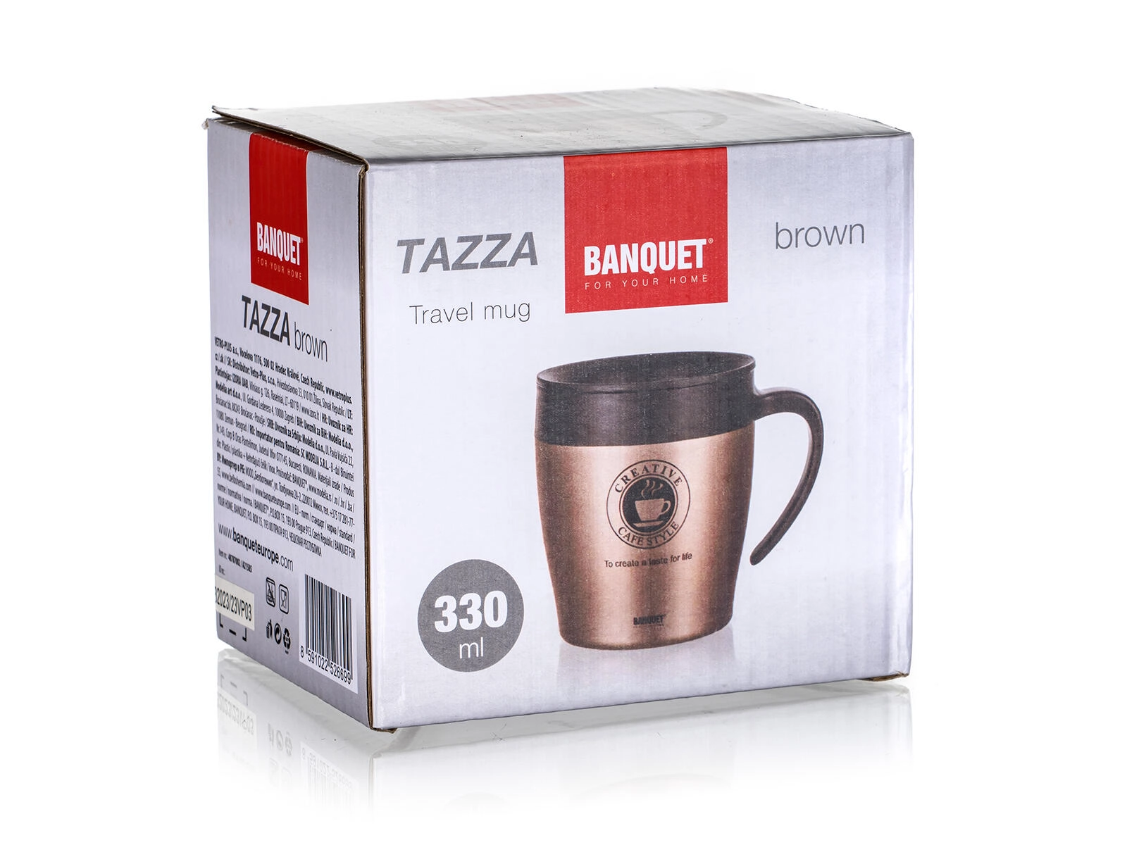 Stijlvolle dubbelwandige thermobeker TAZZA 330 ml in een bruine metallic kleur houdt je dranken langer warm en koud. Heeft een vacuüm roestvrijstalen body, een comfortabel deksel met schuifsluiting en een ergonomisch oor voor een zekere grip. Ideaal voor op reis, naar het werk en in de auto.