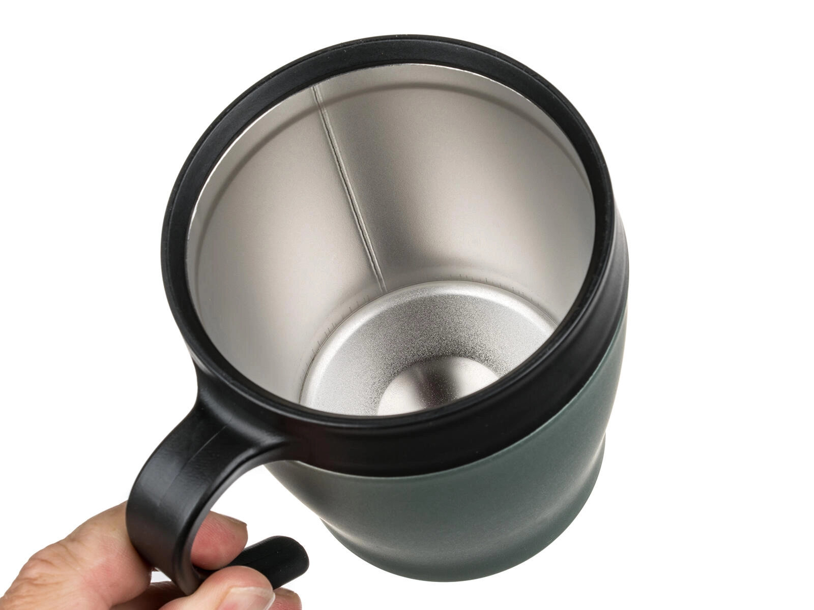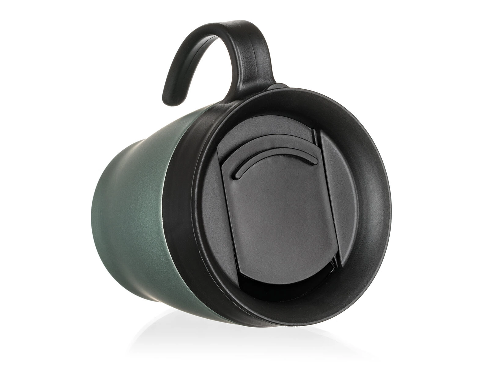 Het praktische deksel maakt comfortabel drinken onderweg mogelijk. Het deksel is niet volledig lekvrij – voor veilig gebruik raden we aan rechtop te bewaren. De elegante groen-grijze metallic afwerking geeft extra stijl aan je dagelijkse ritueel.