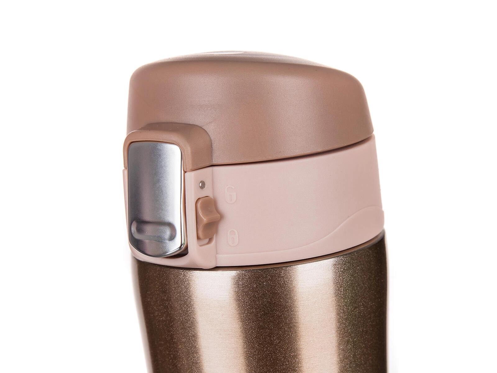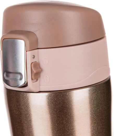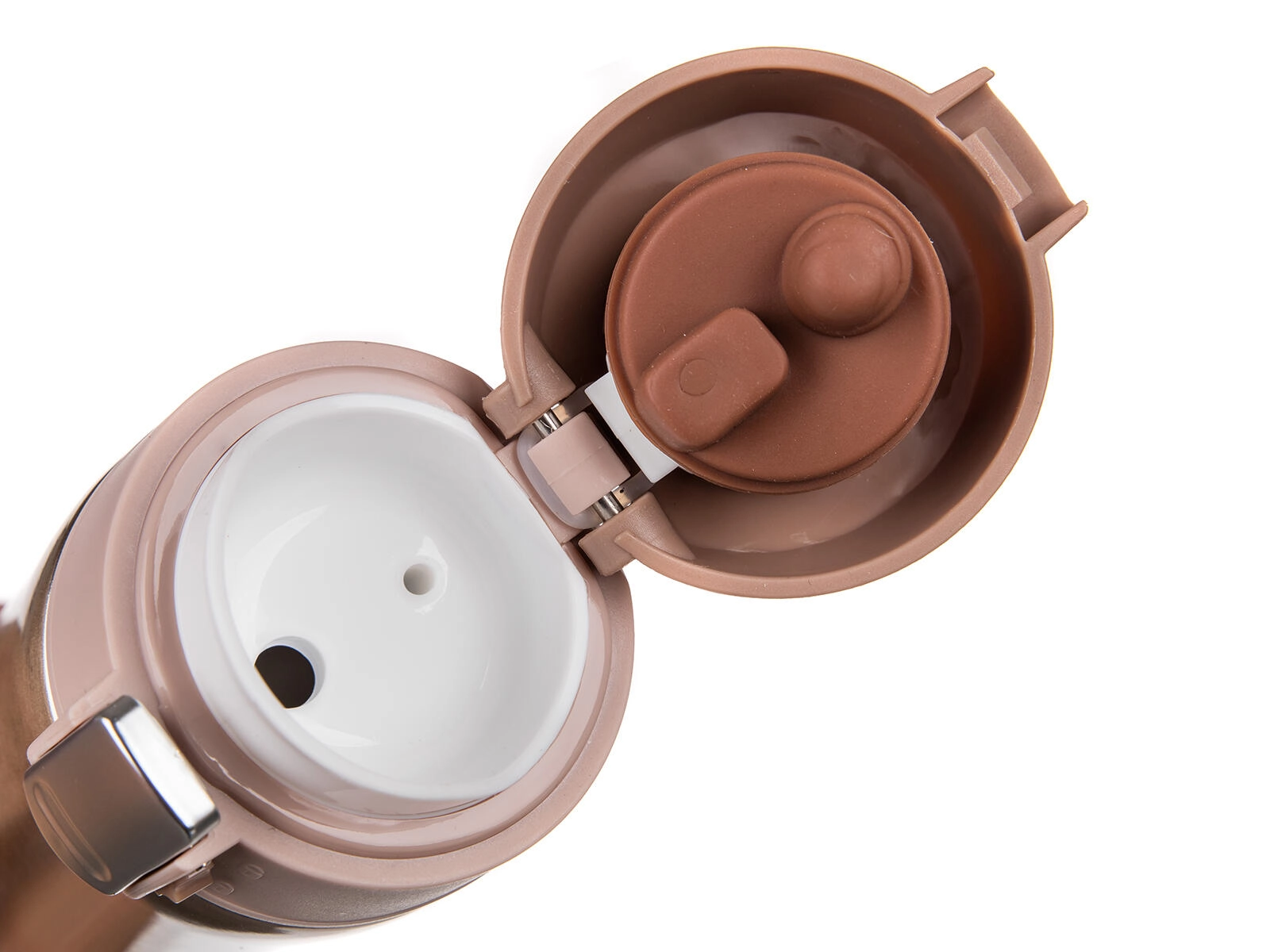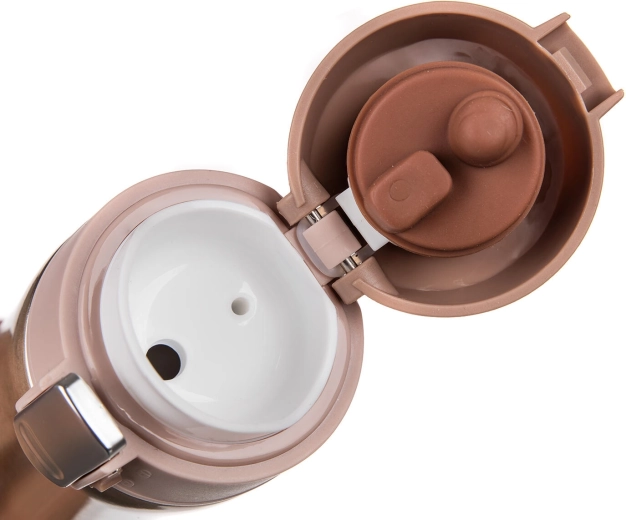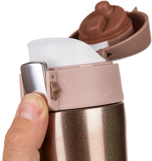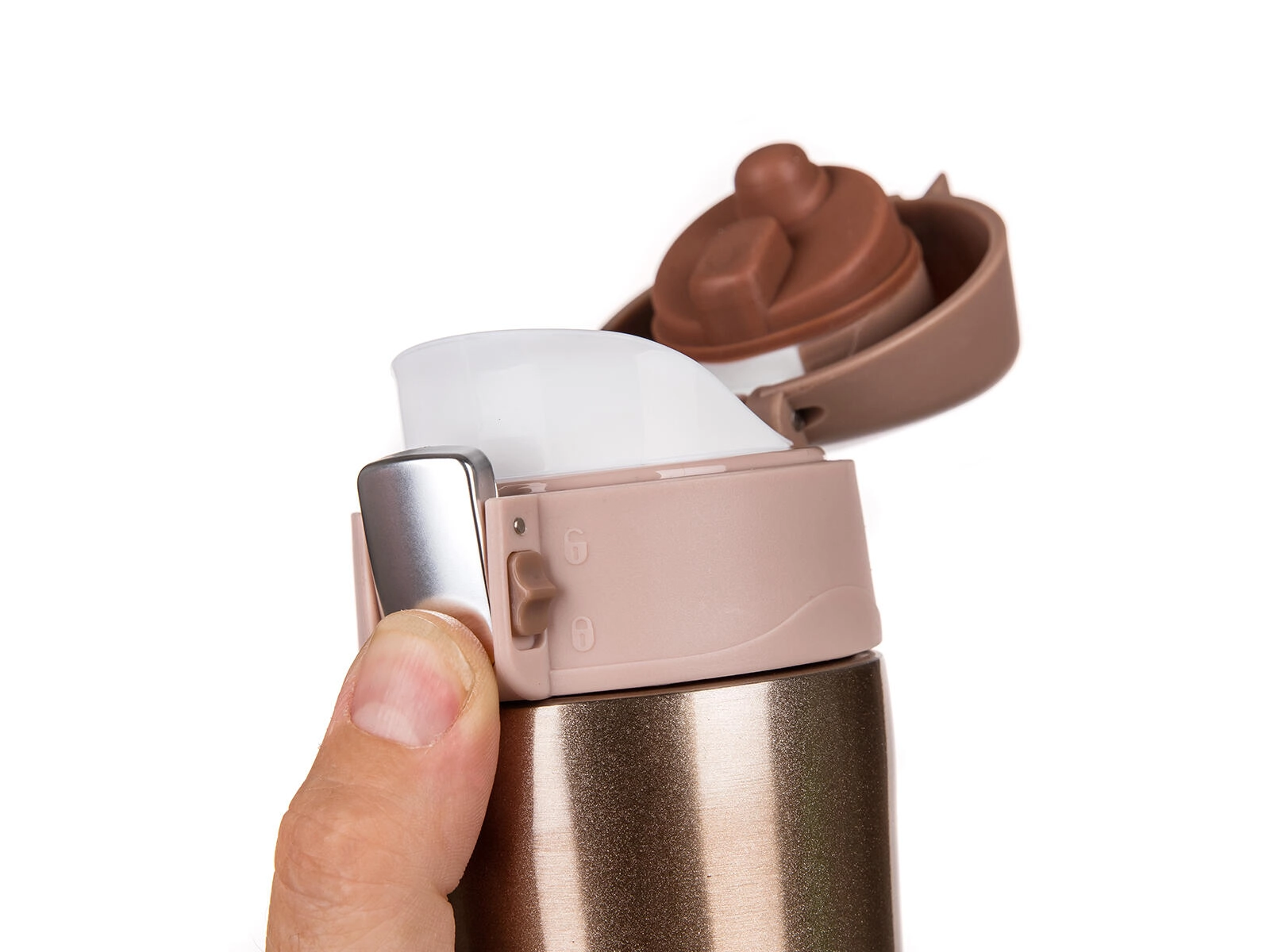 Het deksel opent comfortabel met een druk op de vergrendeling en is voorzien van een slot dat onbedoeld openen in je tas voorkomt. De zorgvuldig ontworpen tuit met ventilatieopening zorgt voor soepel schenken en drinken zonder morsen.