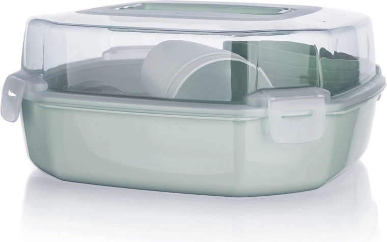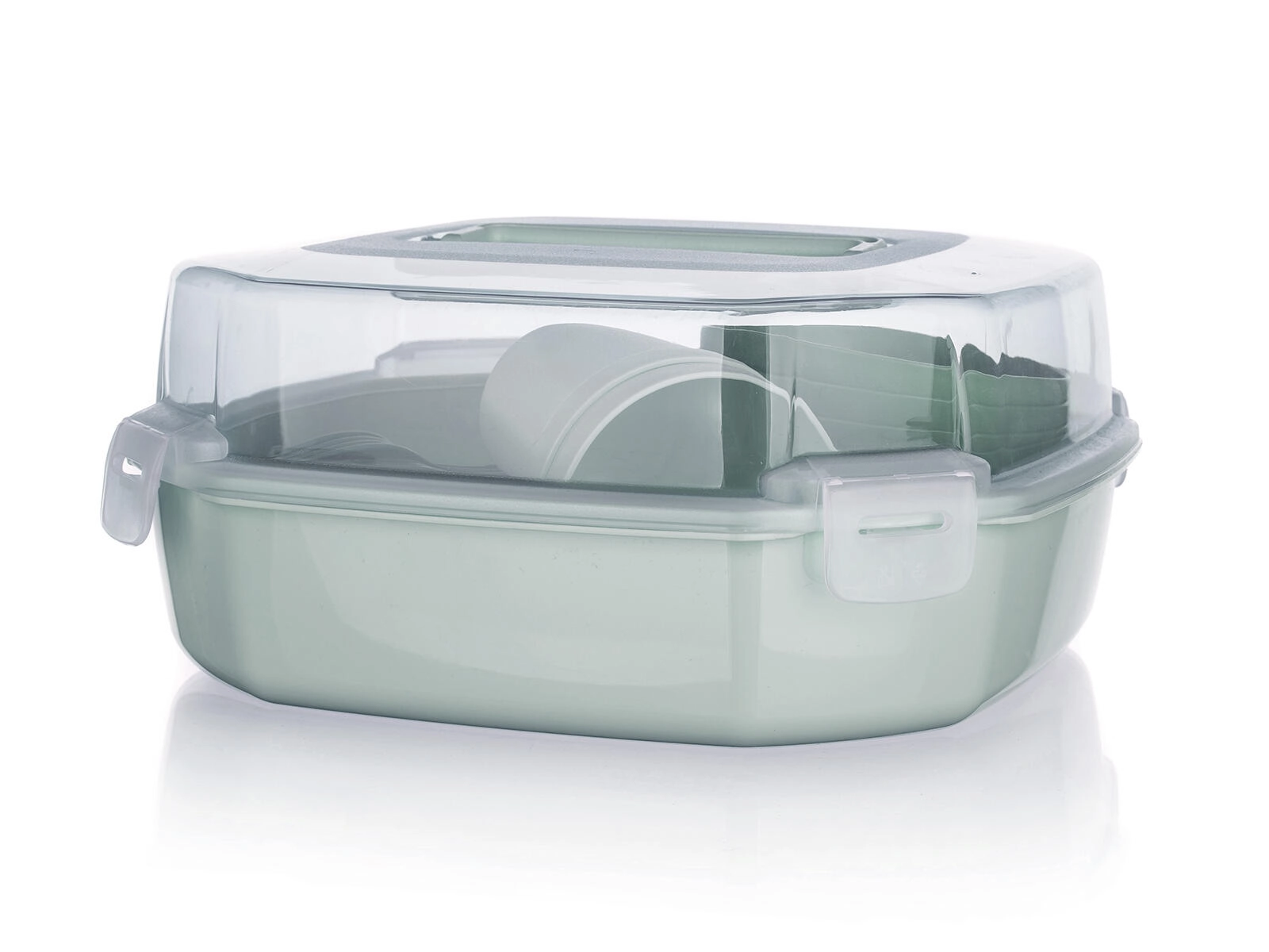 Al het servies berg je op in een draagbare doos met deksel. Houdt alles bij elkaar, beschermt tegen vuil en maakt transport eenvoudig.