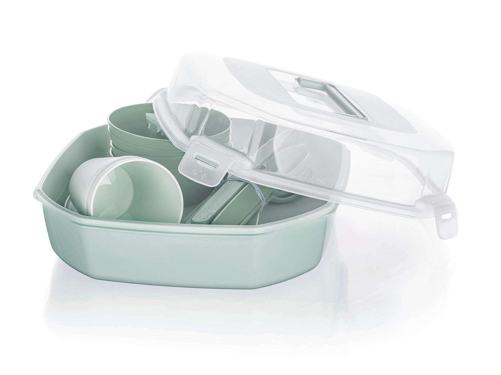 Geniet van comfortabel tafelen onderweg met deze camping eetset van 26 stuks in de kleur mint. De lichte kunststof uitrusting bevat borden, kommen, bekers en bestek voor vier personen en alles is opgeborgen in een praktische afsluitbare doos voor eenvoudig meenemen en opbergen.