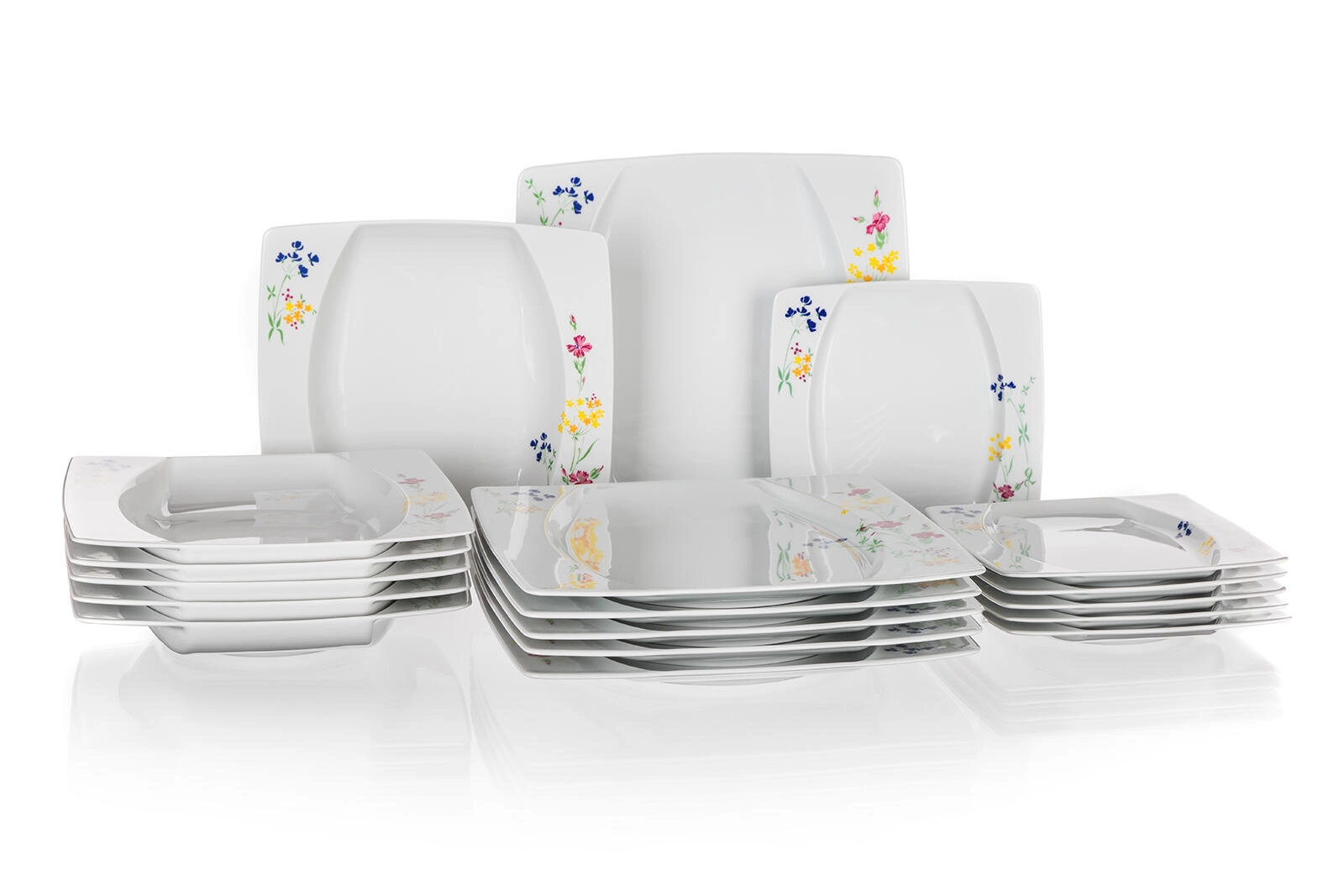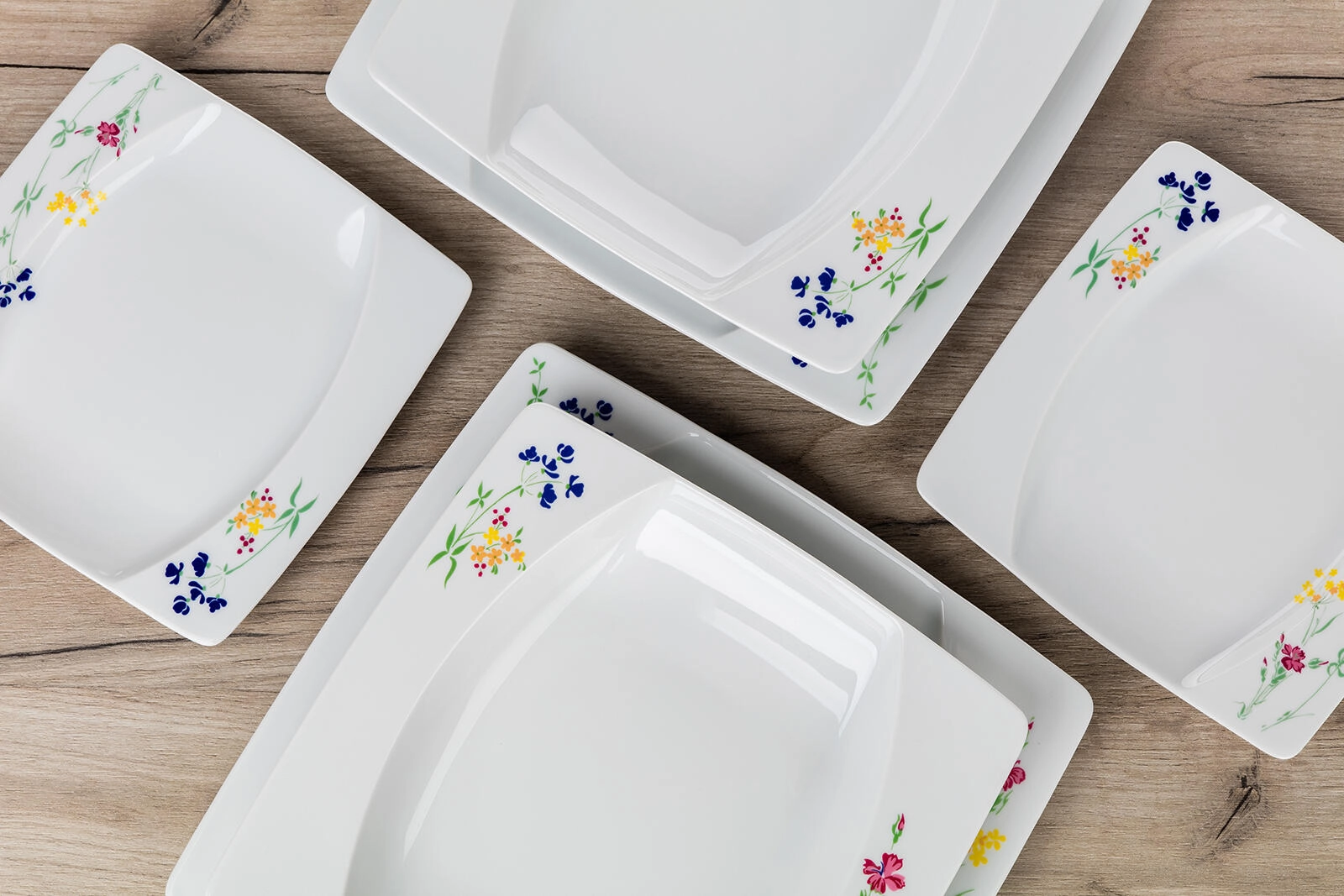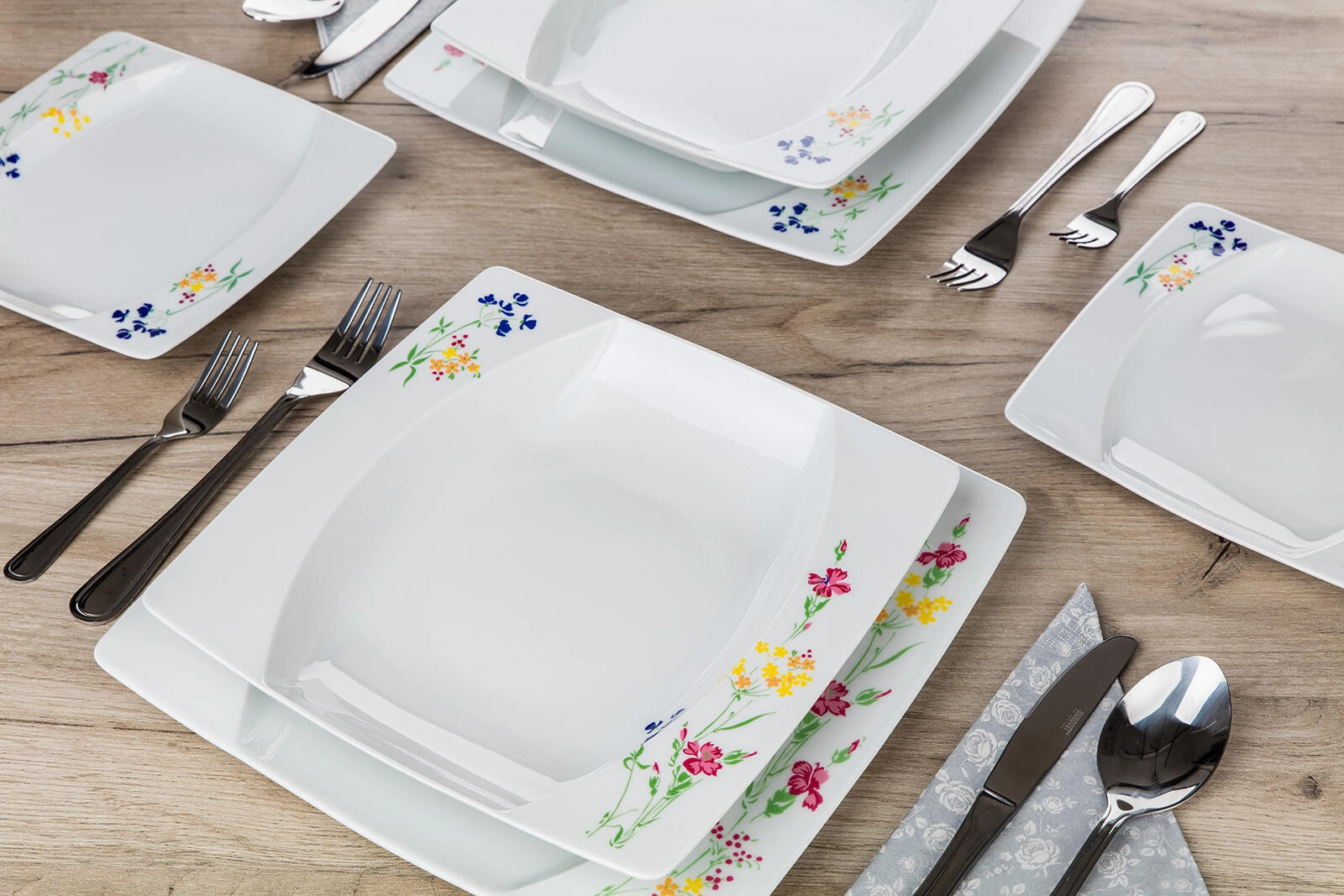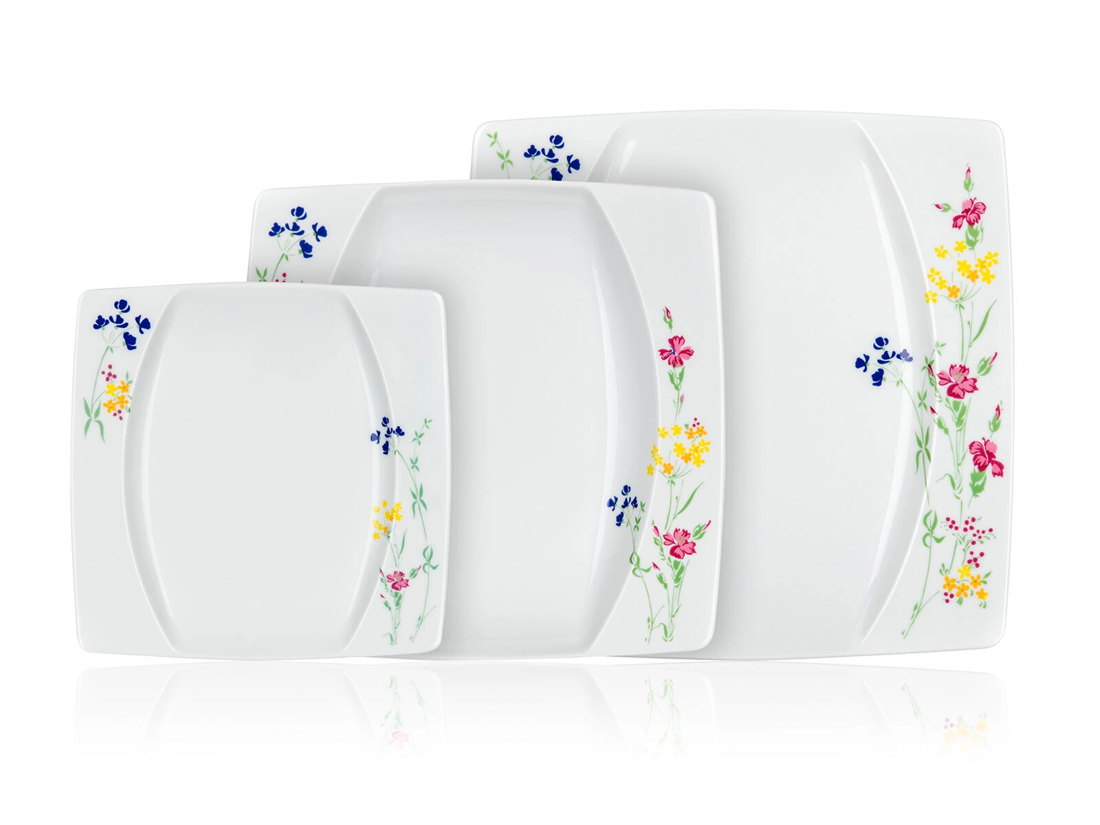 Elegante 18-delige dinerset EYE van hoogwaardig THUN-porselein in een modern vierkant design geeft je tafel een frisse stijl. De borden met subtiel bloemendecor hebben een glanzend oppervlak, zijn stapelbaar en geschikt voor de vaatwasser en magnetron.