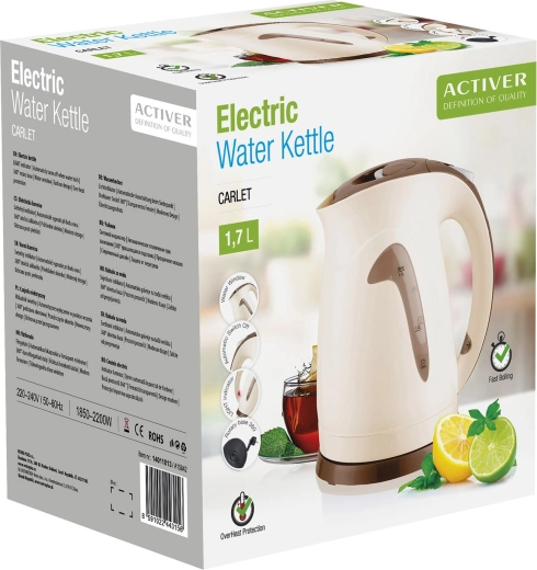 Elegante waterkoker Carlet met een inhoud van 1,7 l in beige‑bruine uitvoering biedt een vermogen tot 2200 W voor snel water verwarmen. Voorzien van een roestvrijstalen vlakke bodem, doorzichtige peilindicator, 360° draaibaar voetstuk, oververhittingsbeveiliging en automatische uitschakeling met lichtindicator.