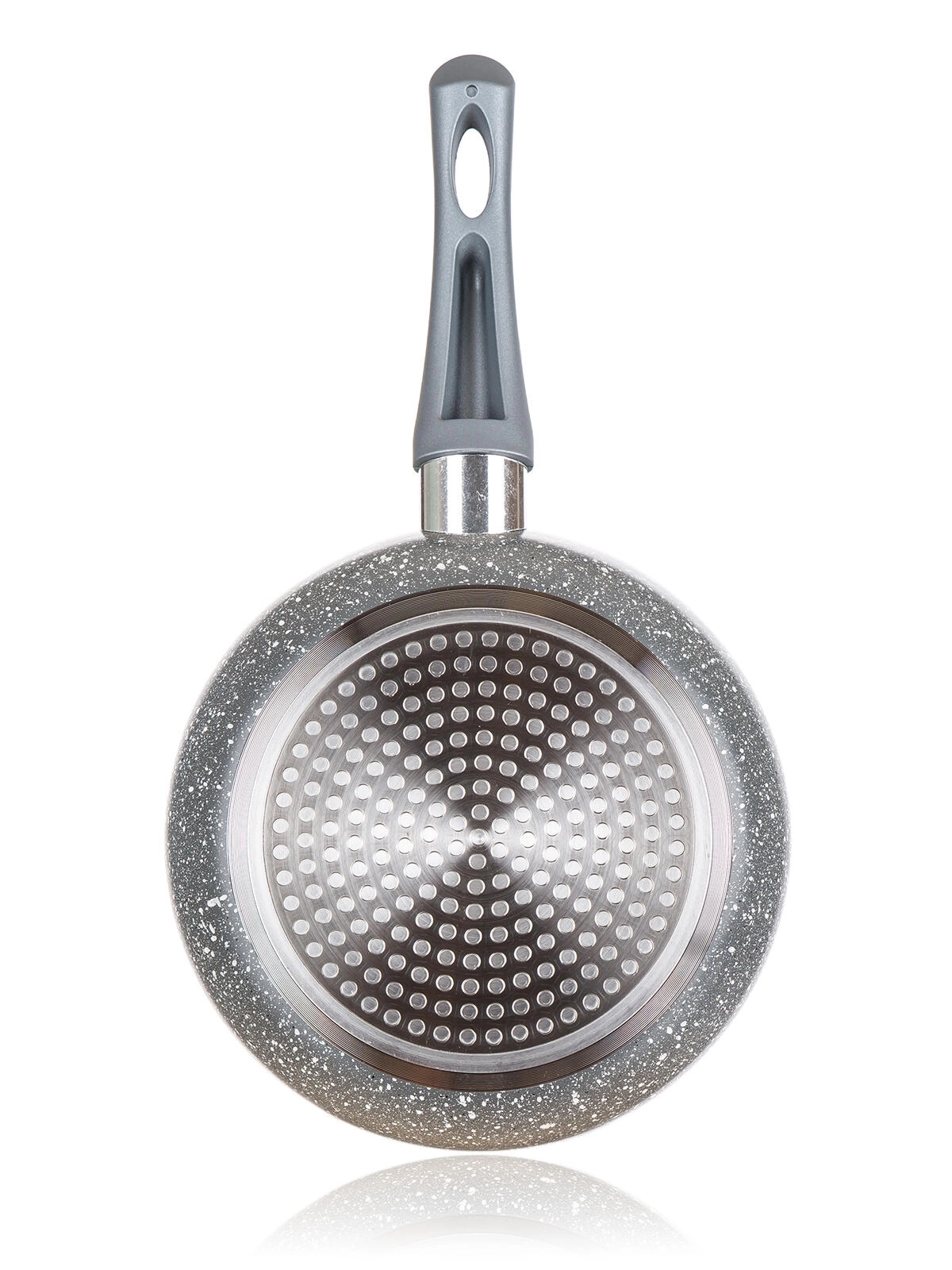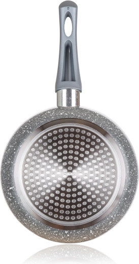De ergonomische handgreep biedt een comfortabele en zekere grip, terwijl de duurzame, hittebestendige buitencoating de levensduur van het kookgerei verlengt. De stijlvolle grijze granietlook past in elke keuken. De pan is compatibel met alle soorten kookplaten, inclusief inductie.
