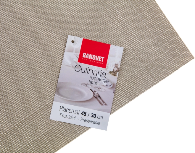 Praktische placemat in een elegante latte-tint van 45 × 30 cm beschermt het tafelblad en voegt stijl toe aan de tafelschikking. Gemaakt van een duurzame mix van 75% PVC en 25% PES, gemakkelijk afwasbaar, bestand tegen vervuiling, met een anti-slip geweven oppervlak en betrouwbare bescherming tegen krassen en warmte.