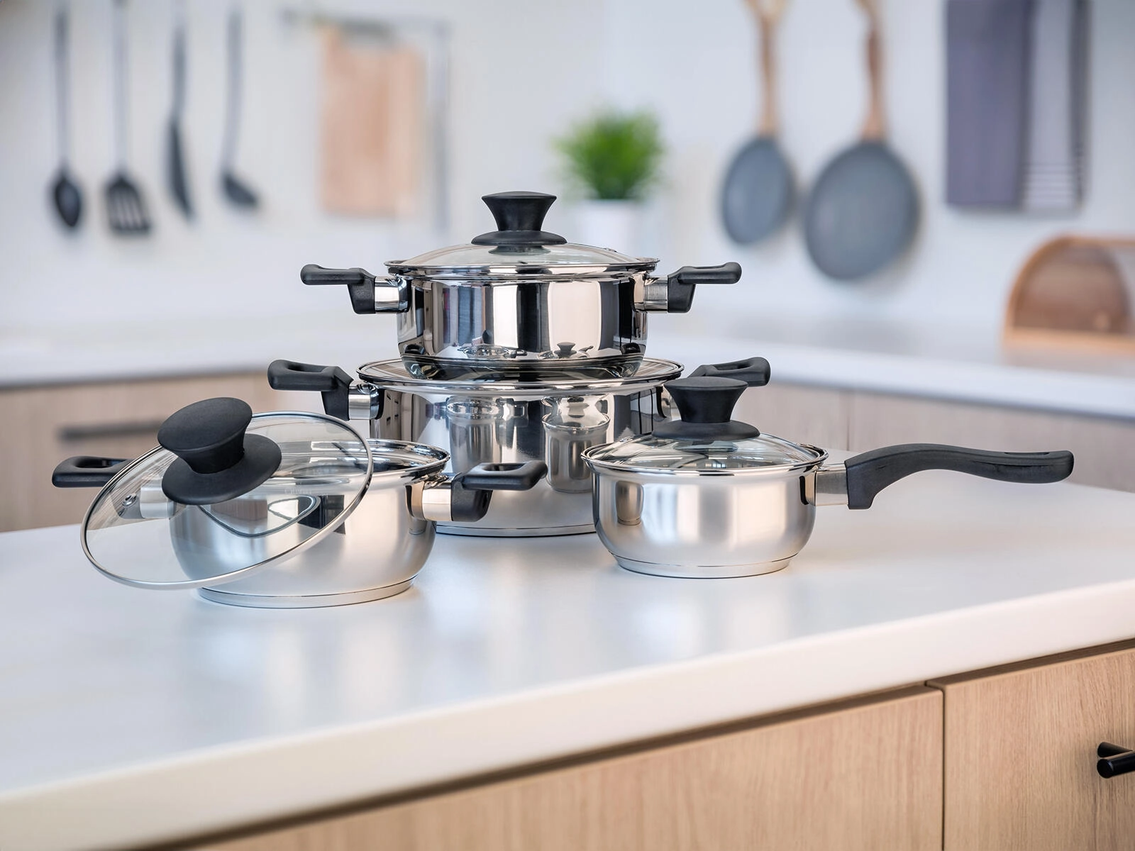 Inhoud van de set: steelpan 14 × 7 cm met glazen deksel; pannen 16 × 8 cm, 18 × 9 cm en 22 × 11 cm – allemaal met glazen deksels. Ideale keuze voor je eerste keuken of als betrouwbare vervanging van je huidige uitrusting.