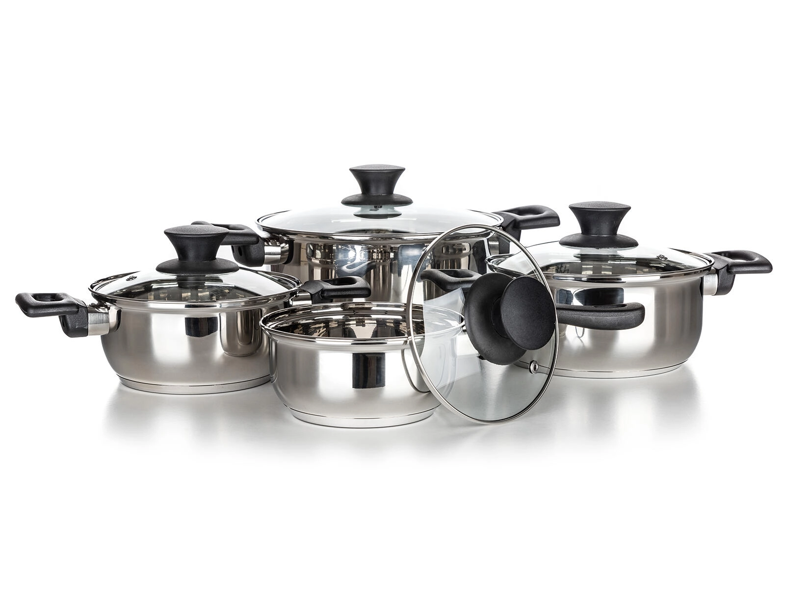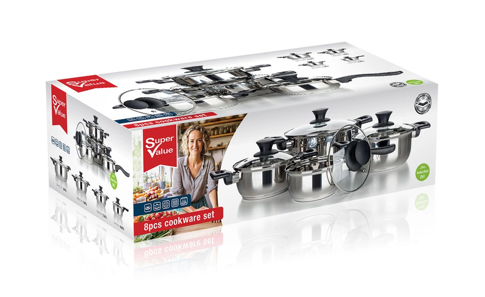Complete 8-delige set roestvrijstalen kookgerei Super Value voor dagelijks koken. Duurzaam roestvrij staal met glanzende afwerking, gehard glazen deksels met stoomventiel en compatibel met alle soorten kookplaten, inclusief inductie. Eenvoudig onderhoud en vaatwasmachinebestendig.