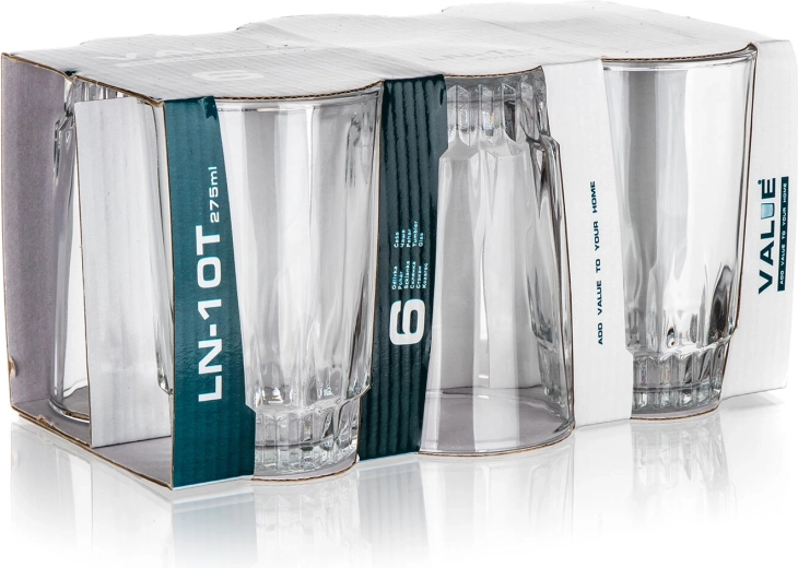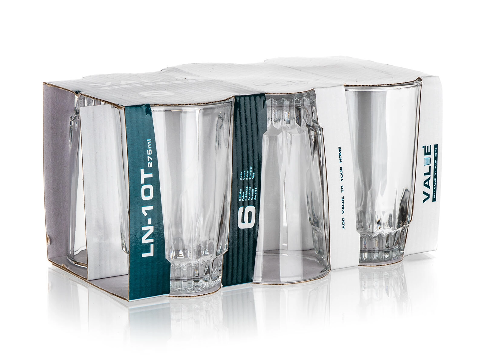De set van zes universele VALUE-glazen met een inhoud van 275 ml brengt een tijdloze uitstraling naar elke tafel. De stevige, getextureerde bodem zorgt voor uitstekende stabiliteit en weerstand tegen omvallen, terwijl de gladde wanden het reinigen en dagelijks gebruik vergemakkelijken.