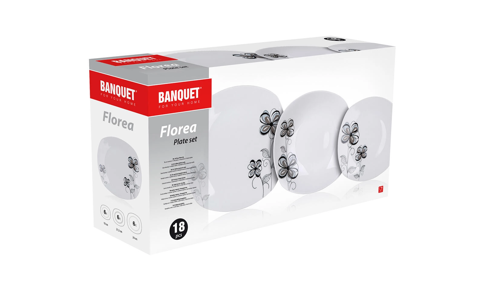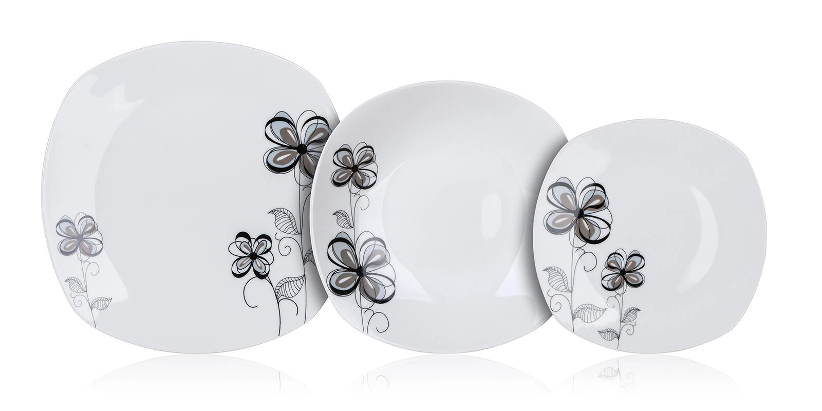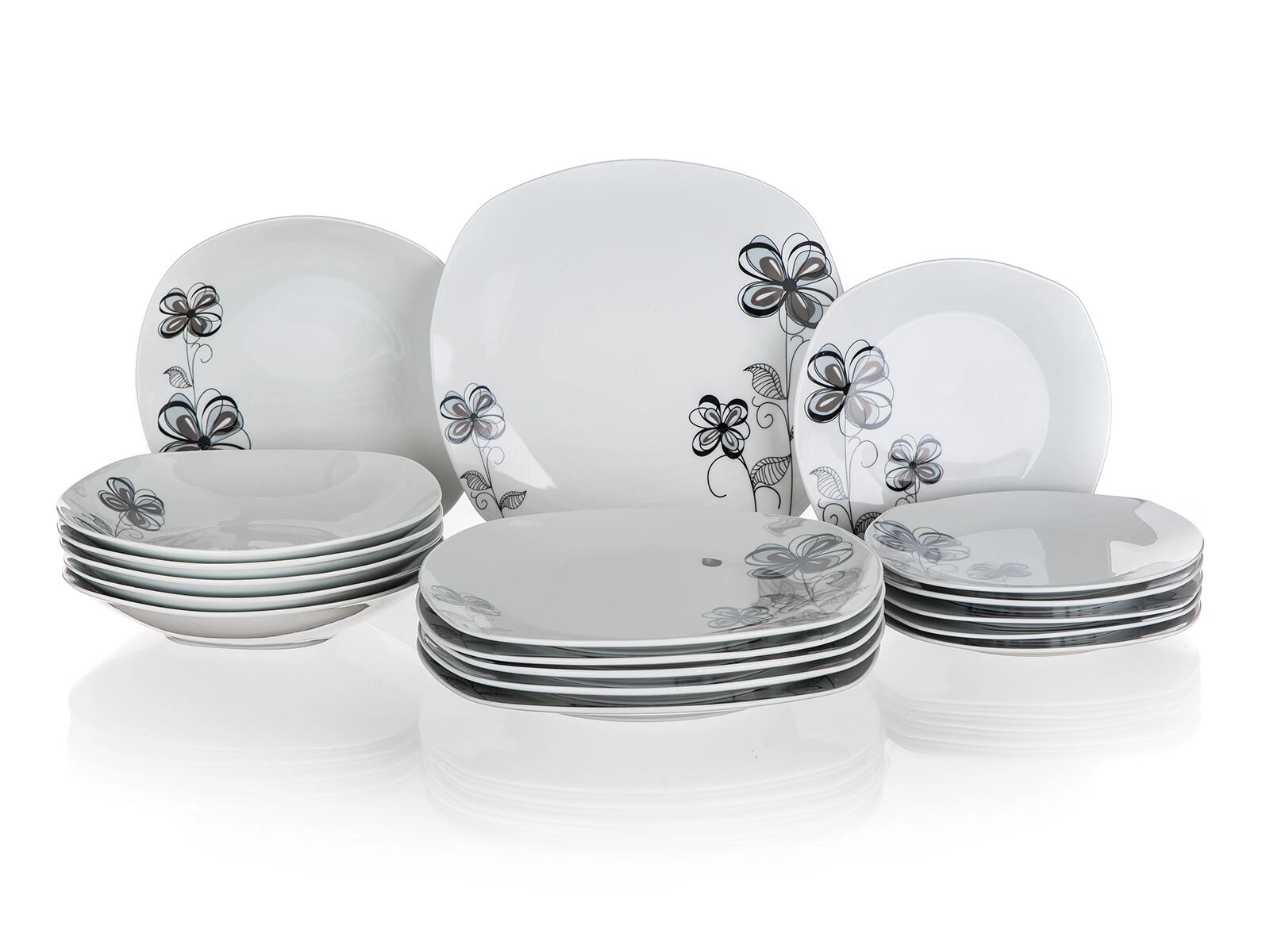De FLOREA Square dinerset van hoogwaardig porselein valt op door de moderne vorm met afgeronde hoeken en het subtiele zwart-grijze bloemendecor. Ideaal voor het serveren van soepen, hoofdgerechten en desserts, en eenvoudig te combineren met ander servies op uw tafel.