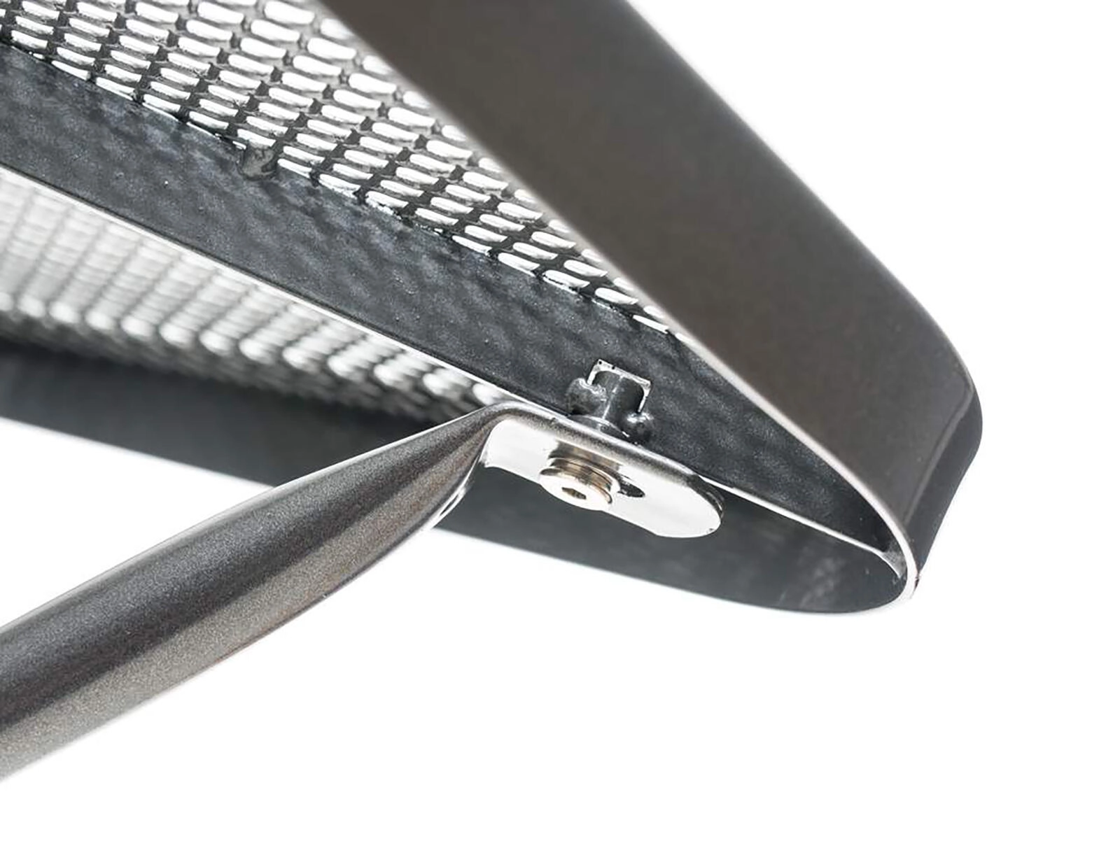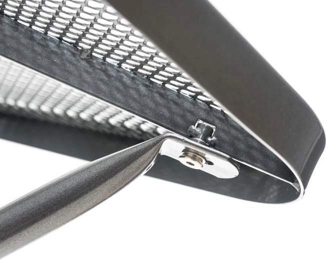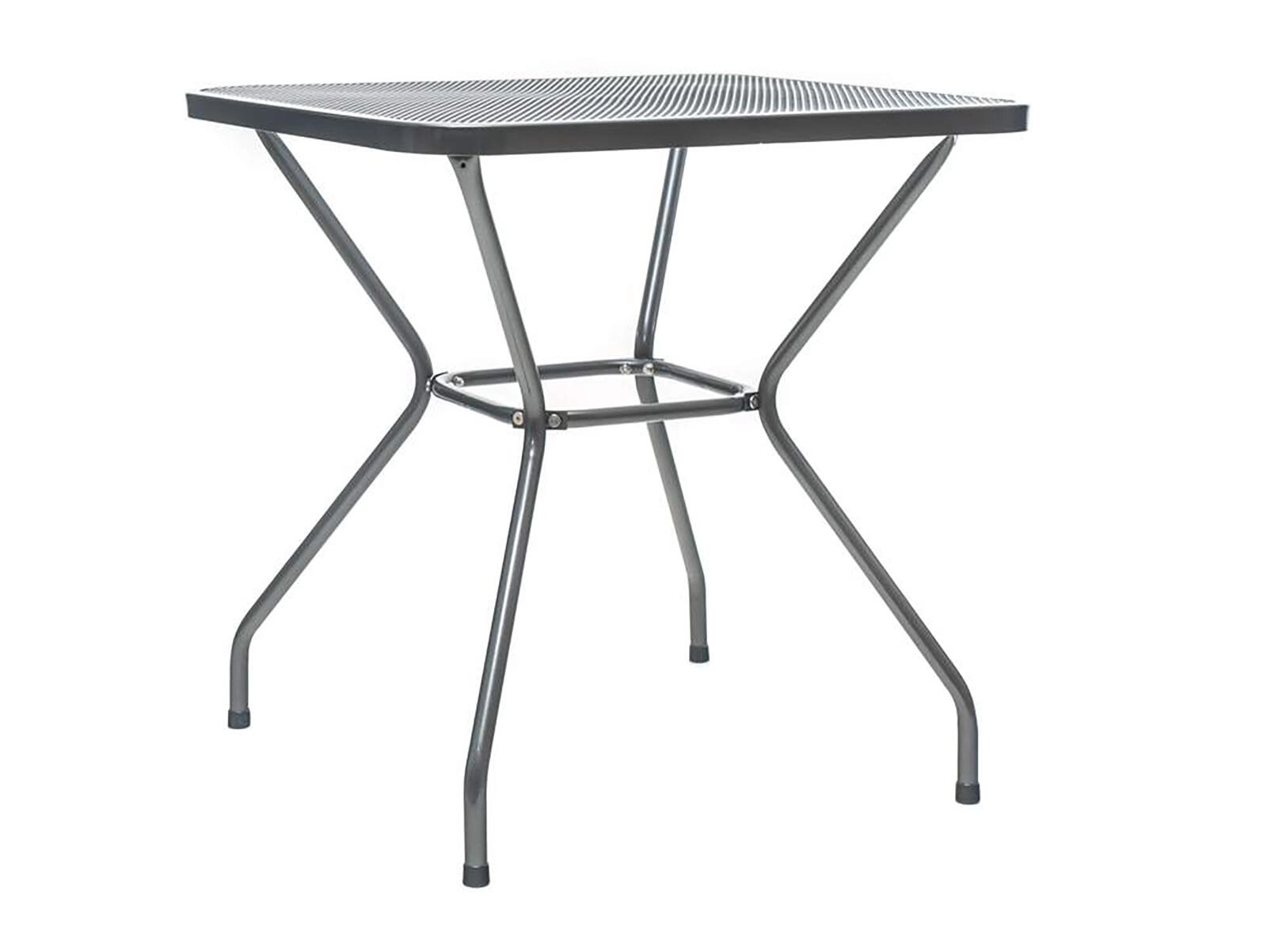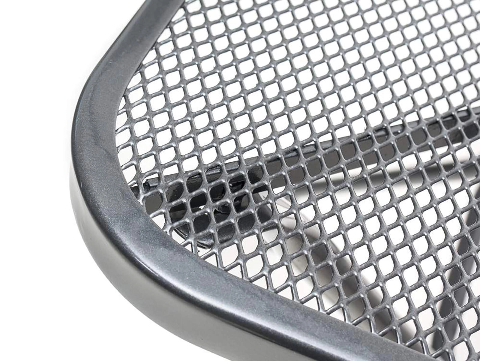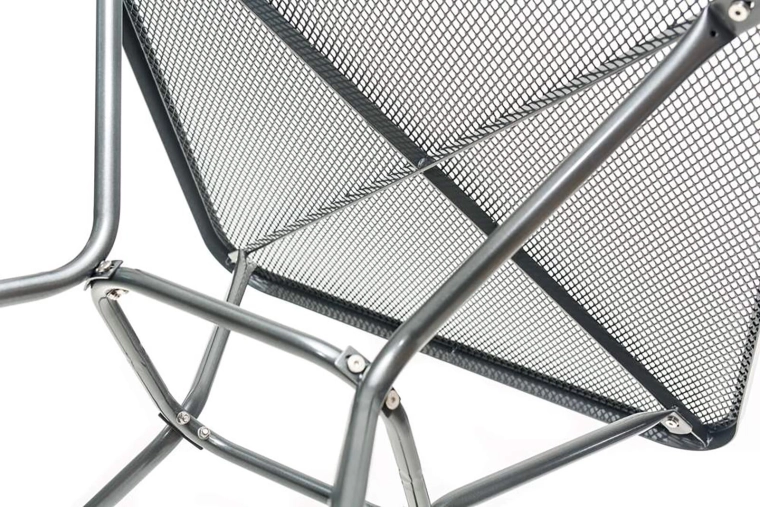 Het metalen, roosterachtige blad bevordert waterafvoer en snel drogen, zodat de tafel kort na een regenbui weer klaar is voor gebruik.