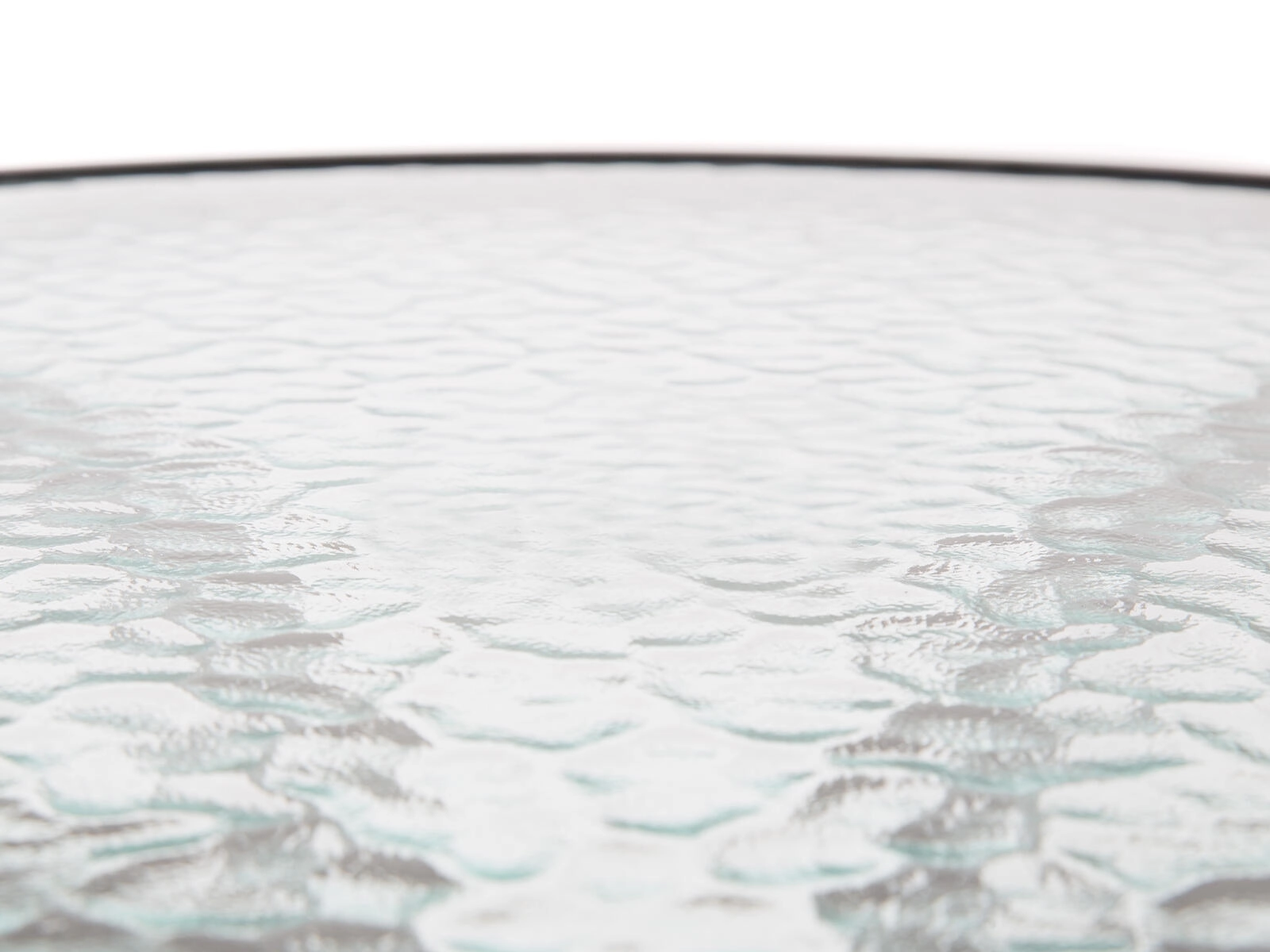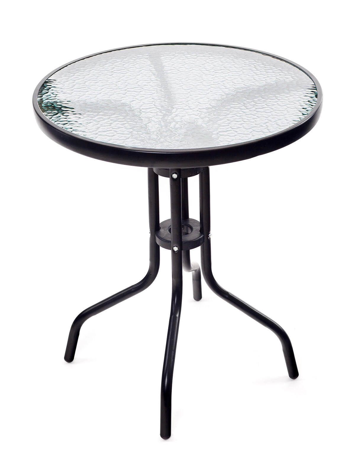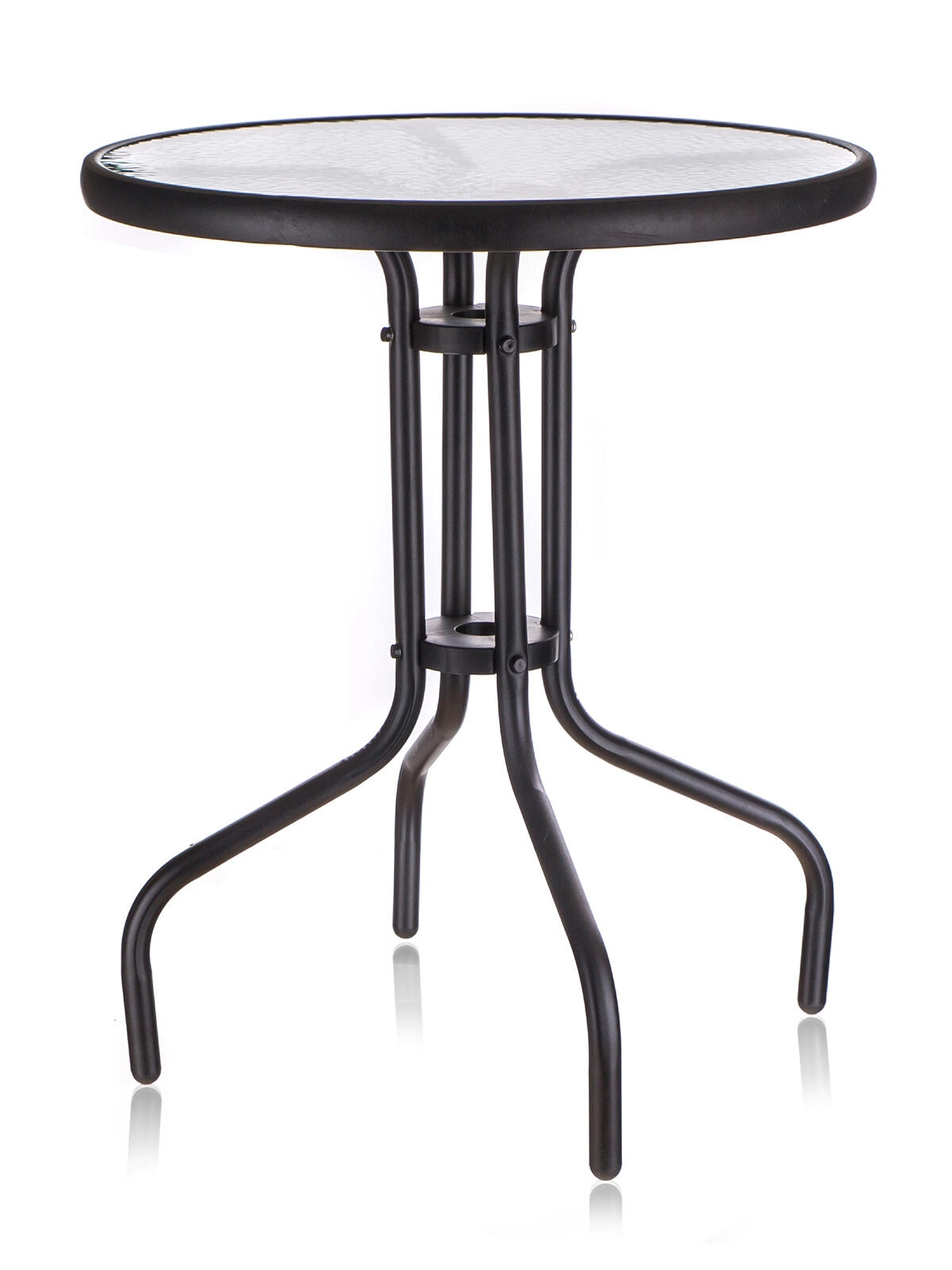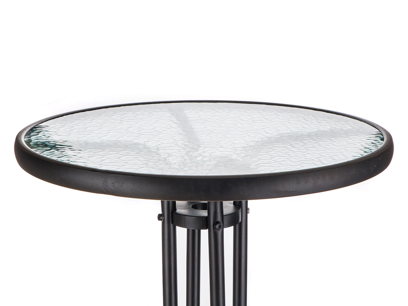 Stijlvolle ronde tafel in zwart is een ideale keuze voor kleinere buitenruimtes. Dankzij de compacte afmetingen is hij perfect als bijzettafel bij een zithoek, voor koffie, boeken of bloemen. De metalen constructie oogt stabiel, terwijl het getextureerde glazen blad gemakkelijk te reinigen is en bestand tegen dagelijks gebruik.