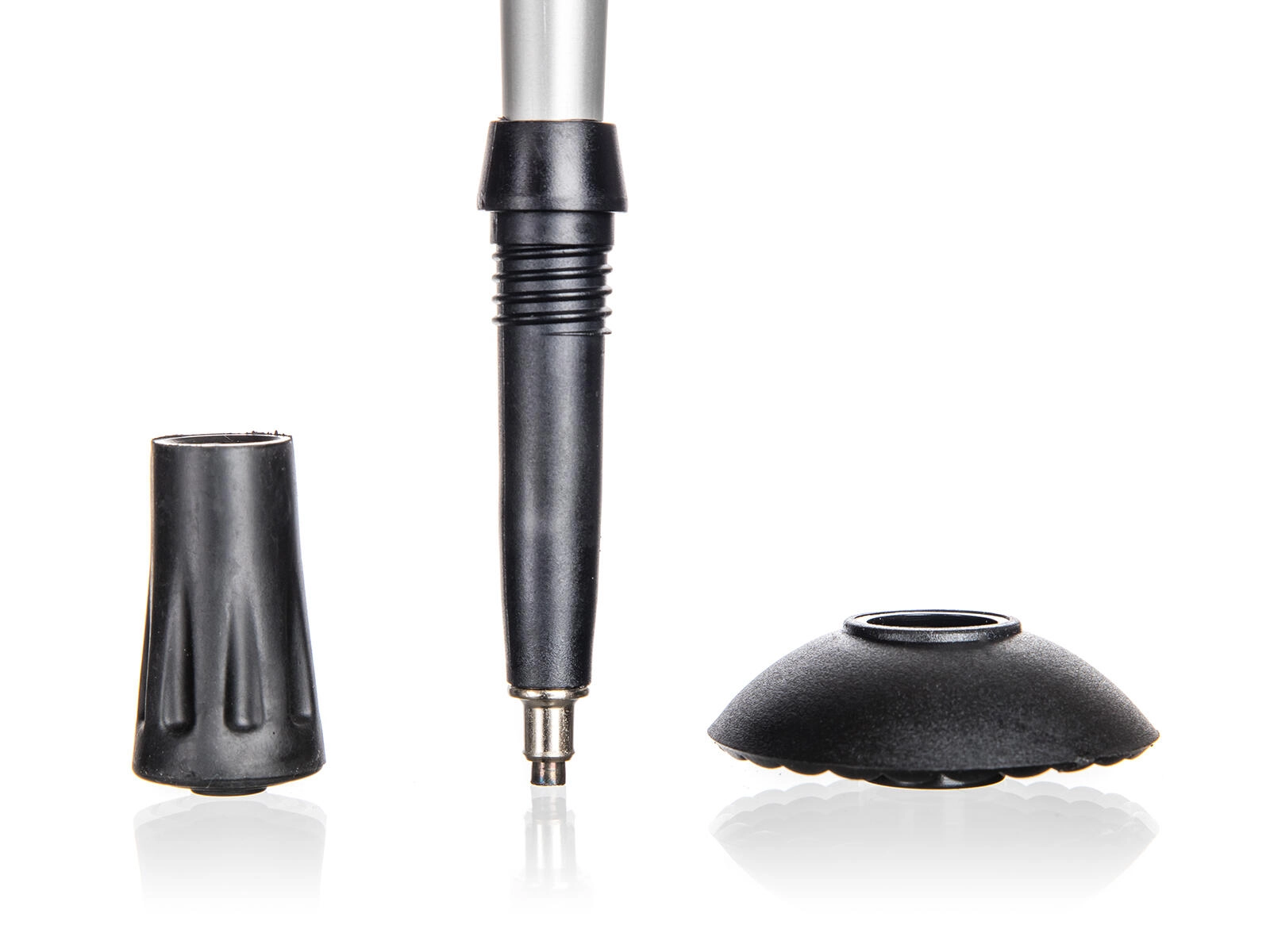 Stalen tip voor zachte ondergrond, rubberen voetdop voor harde oppervlakken en baskets voor gebruik het hele jaar – maximale grip en controle.