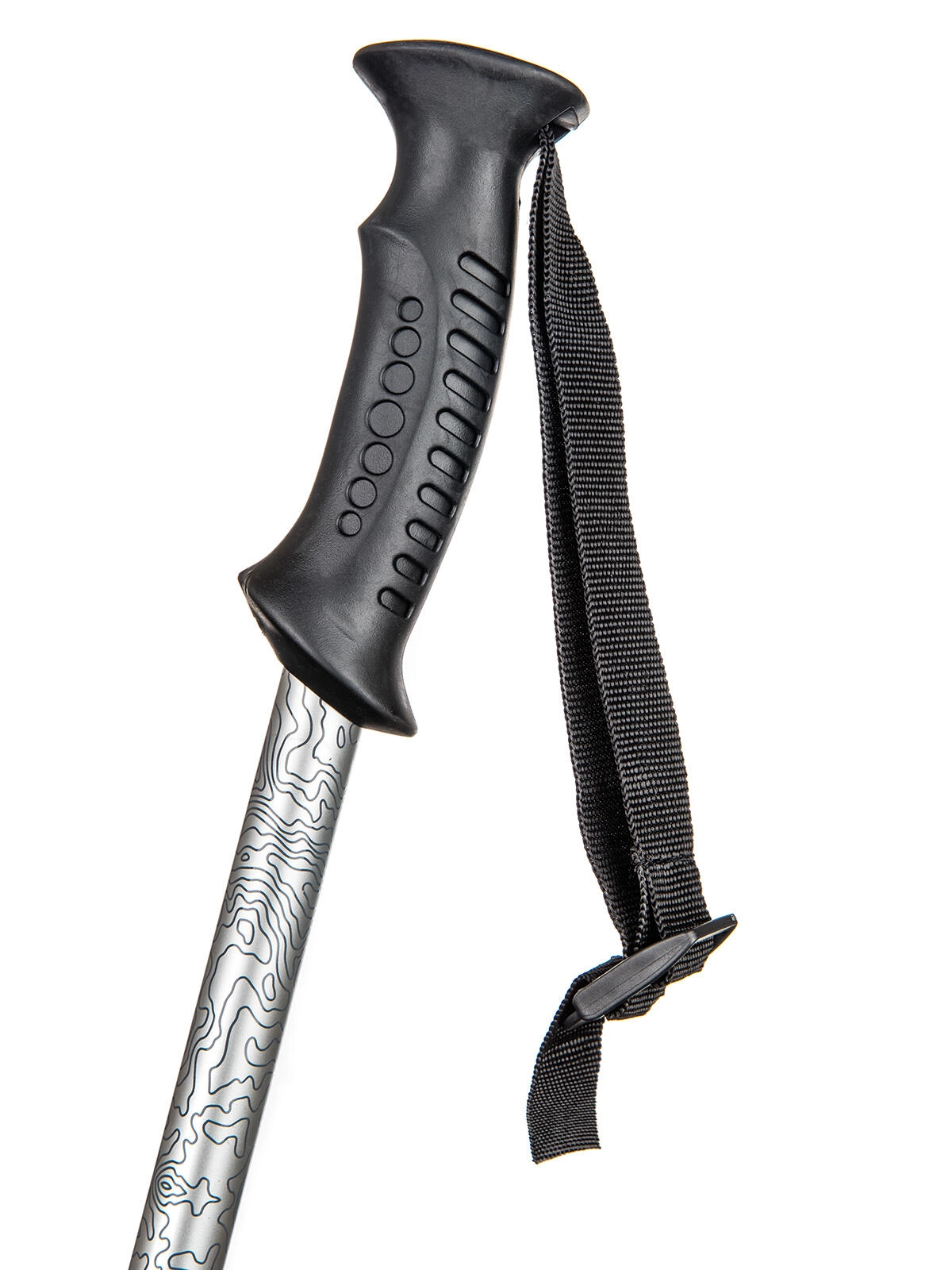 Ergonomische rubberen handgreep met verstelbare polsband en comfortabele schuimverlenging zorgt voor stabiel vasthouden, ook tijdens lange tochten en wisselende hellingen.