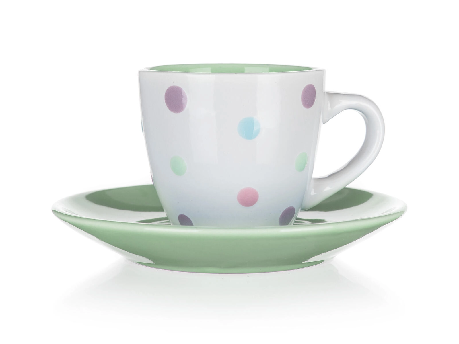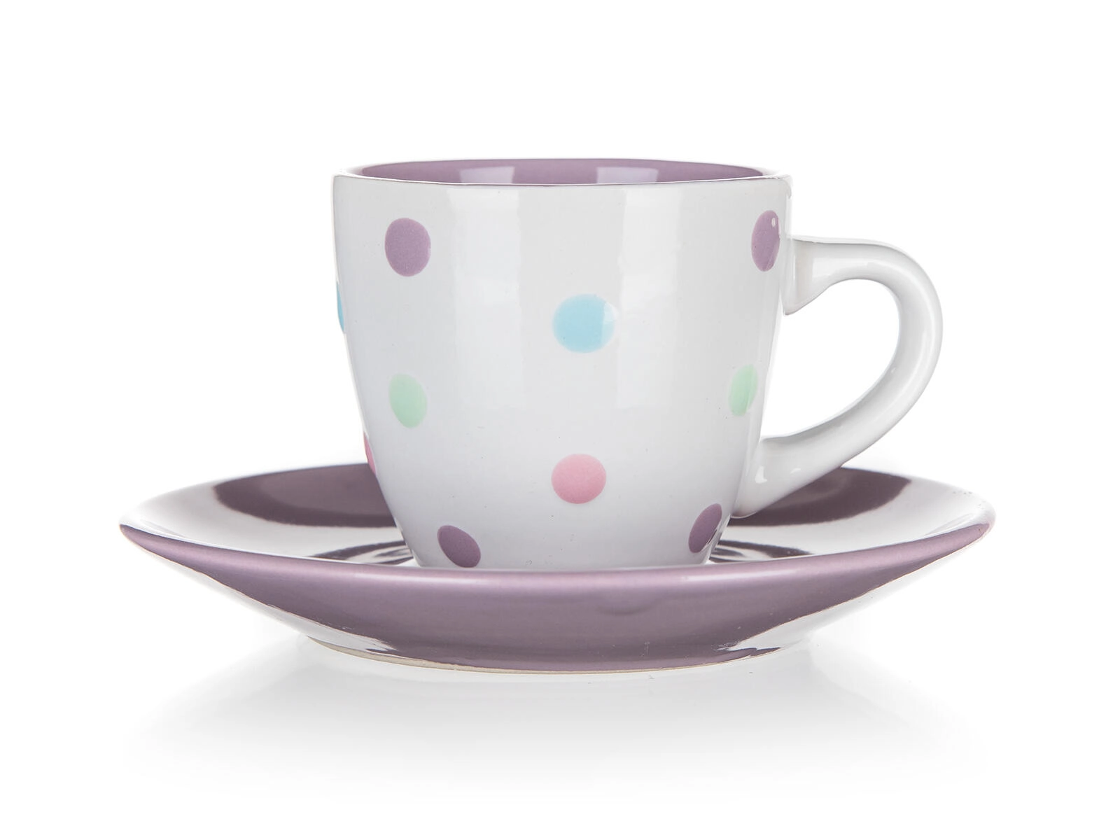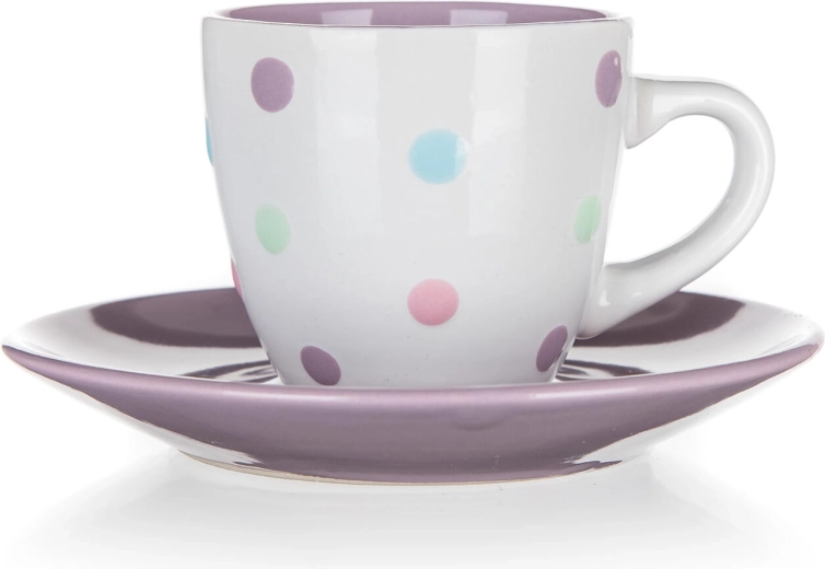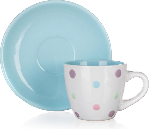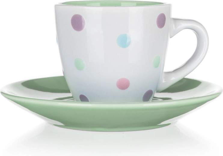 De combinatie van een witte kop met meerkleurige stippen en een bijpassende schotel fleurt elk koffieritueel op en past perfect in zowel een moderne als een vintage keuken.