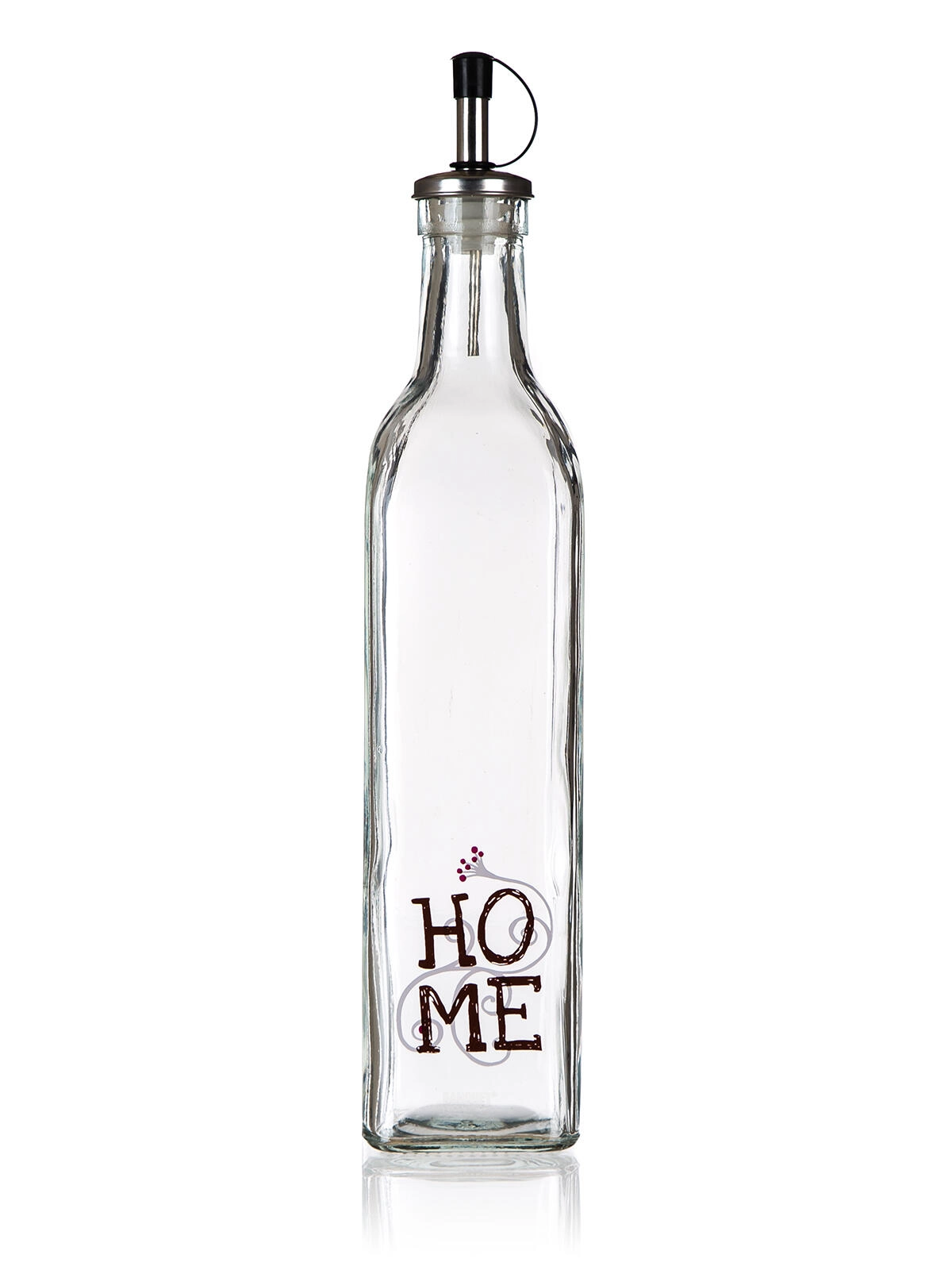 Praktische glazen oliefles met een inhoud van 500 ml met het decor HOME maakt het doseren en bewaren van olie eenvoudig. Dankzij de metalen schenktuit met kunststof dop en afdichting schenk je precies, schoon en zonder druppelen.