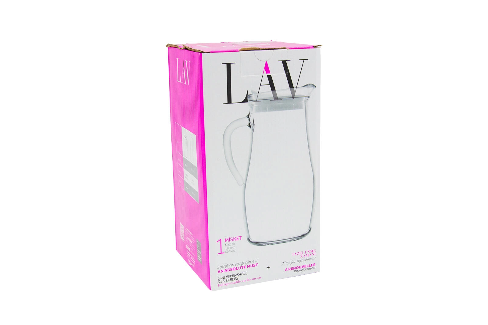 De elegante glazen kan MISKET met een inhoud van 1,8 l is ideaal voor het serveren van water, limonade of sap. Hij biedt een stevige glazen handgreep voor een comfortabele grip, een transparant lichaam voor eenvoudige inhoudscontrole en een kunststof deksel voor schoon en veilig schenken.