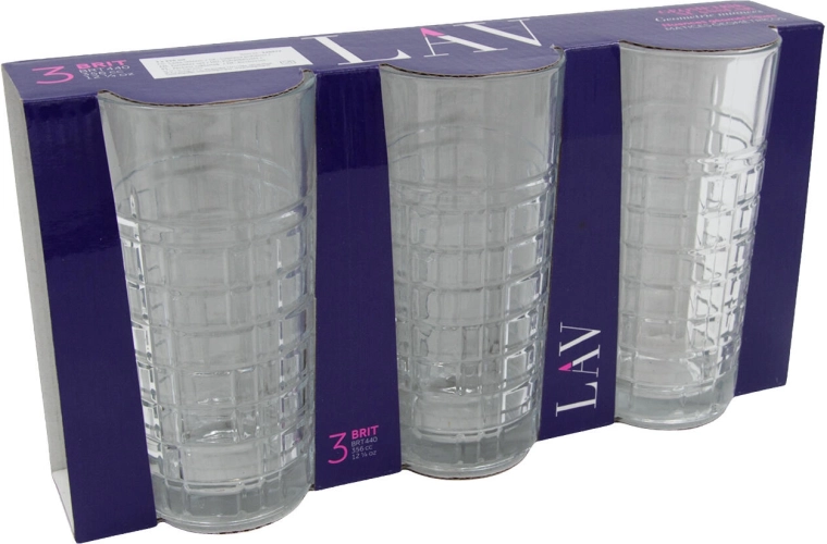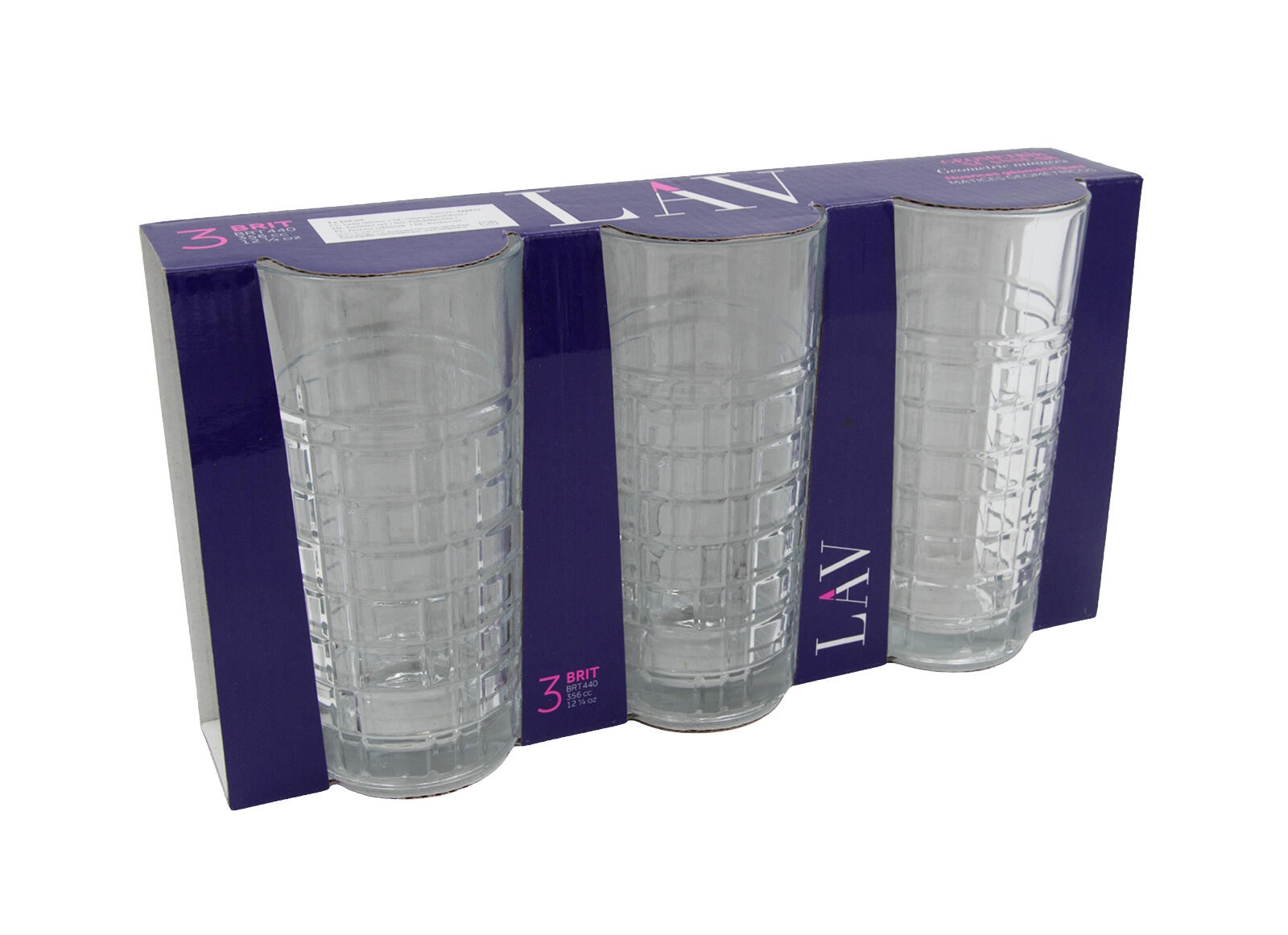 Universele heldere glazen BRIT met een inhoud van 356 ml in een elegant hoog ontwerp, ideaal voor water, limonades en cocktails. Duurzaam, ligt goed in de hand en dankzij de praktische verpakking van 3 stuks geschikt voor ieder huishouden.