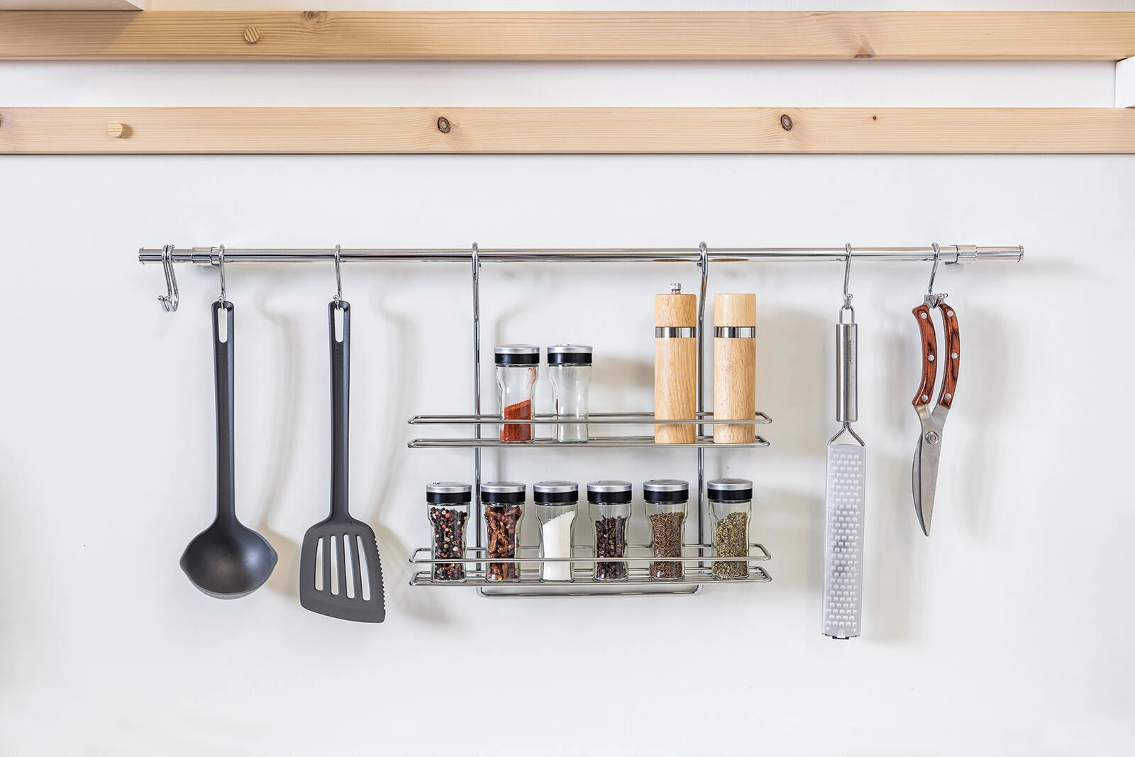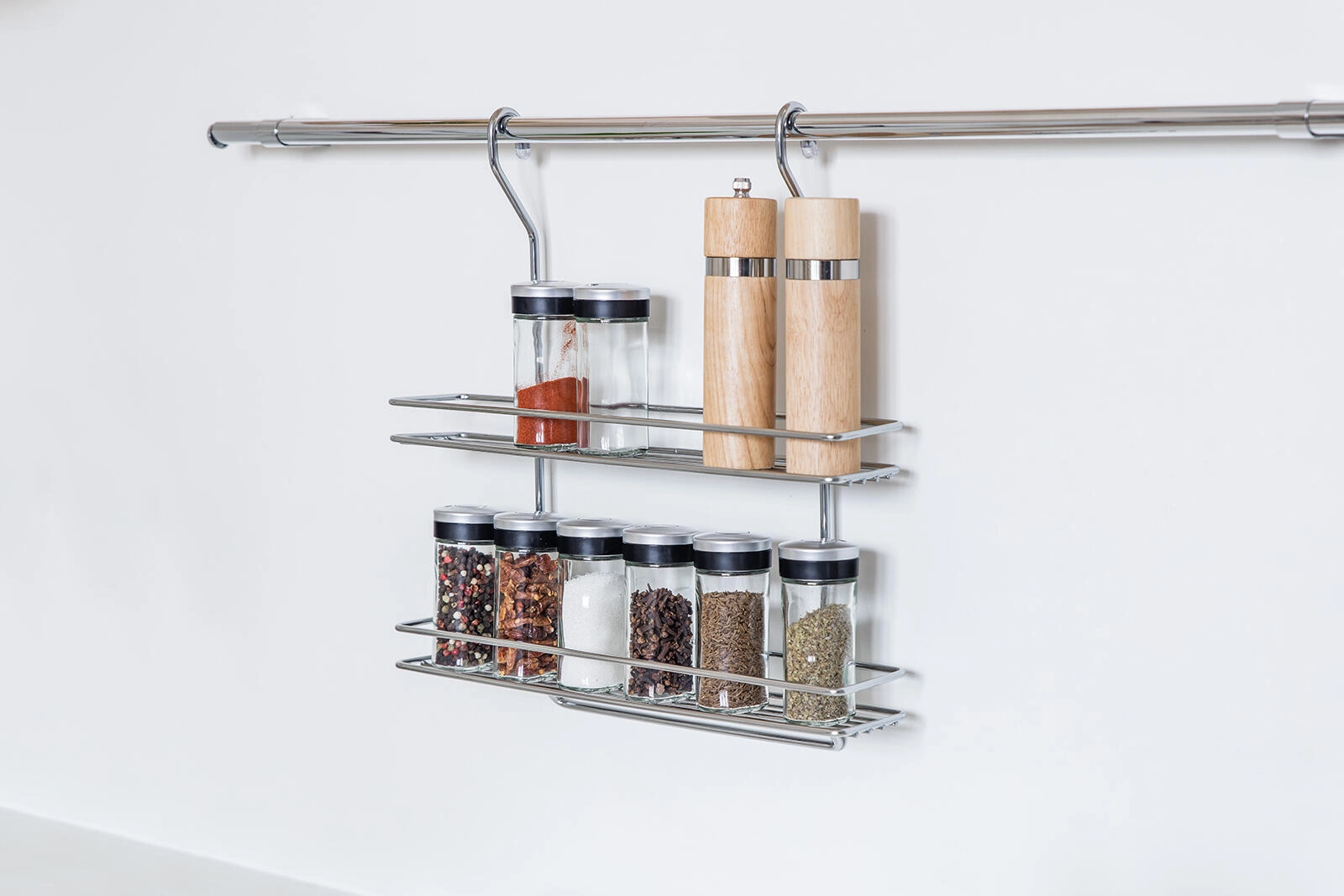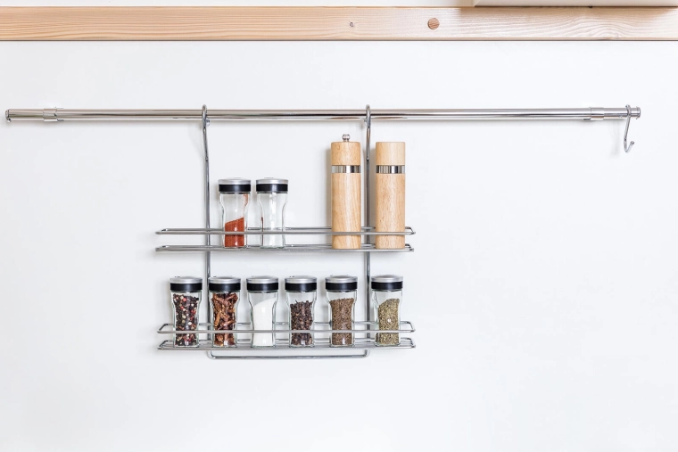 Het open draadontwerp met voorste stoppers houdt kruidenpotjes op hun plaats en maakt snel de juiste keuze vinden mogelijk.