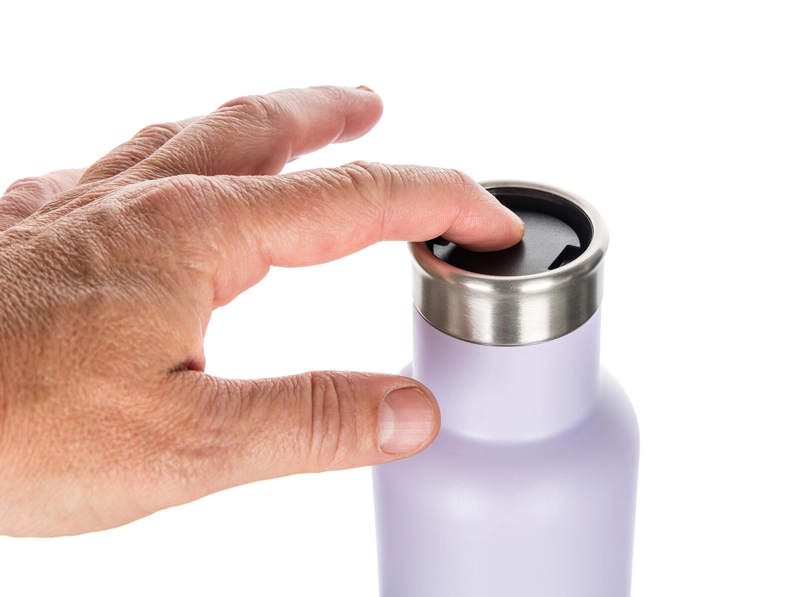 De ronde vergrendeling in de dop maakt schenken mogelijk zonder deze los te draaien. Druk gewoon en schenk veilig – snel, schoon en zonder morsen.