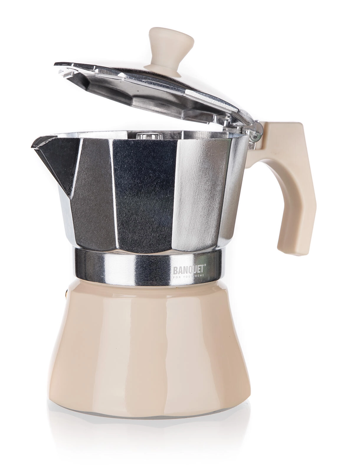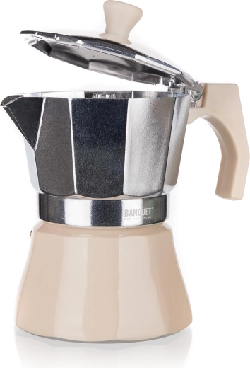 De traditionele moka pot CAMPI voor 6 kopjes zet sterke, aromatische koffie rechtstreeks op het fornuis. Duurzaam aluminium lichaam met veiligheidsventiel, comfortabel serveren en tijdloos design in ivoor. Geschikt voor gas-, elektrische en keramische kookplaten.