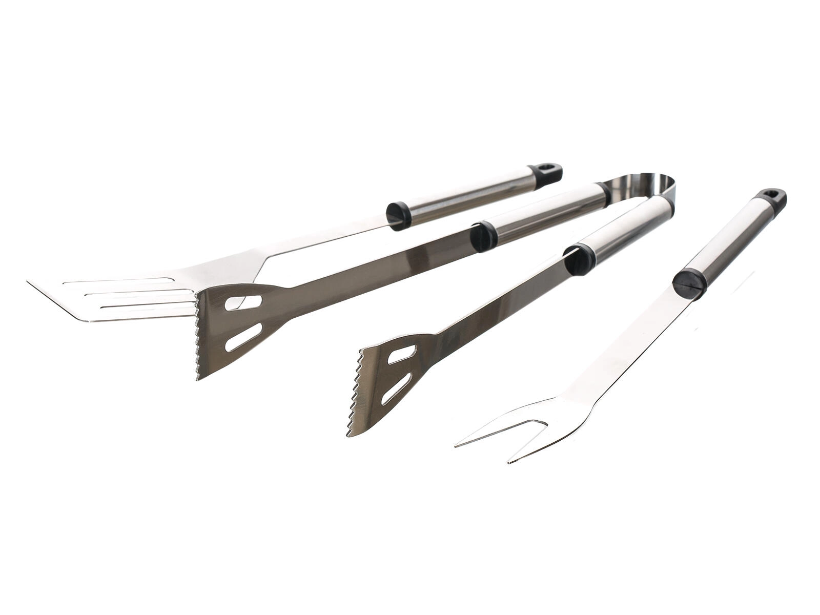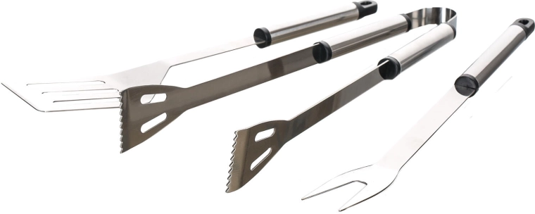 Praktische barbecueset van roestvrij staal met drie basisgereedschappen: tang, spatel en vork. Duurzame uitvoering en ophangogen zorgen voor comfortabel gebruik en eenvoudig opbergen bij elke barbecue.