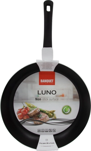 De Luno-pan van 28 cm is gemaakt van geperst aluminium voor snelle en gelijkmatige verwarming. De zwarte antiaanbaklaag aan de binnenzijde met dubbele laag minimaliseert aanbakken en maakt koken met minder olie mogelijk. Dankzij de comfortabele ergonomische handgreep van bakeliet ligt de pan prettig in de hand en is hij eenvoudig te bedienen.