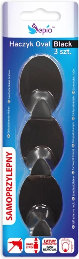 Praktische set van drie zelfklevende ovale haken in elegante zwarte kleur, gemaakt van duurzaam staal. Dankzij de sterke kleeflaag zorgen ze voor snelle montage zonder boren en betrouwbare hechting op gladde oppervlakken. Ideaal voor sleutels, doekjes, handdoeken en kabels in de keuken, badkamer of hal.