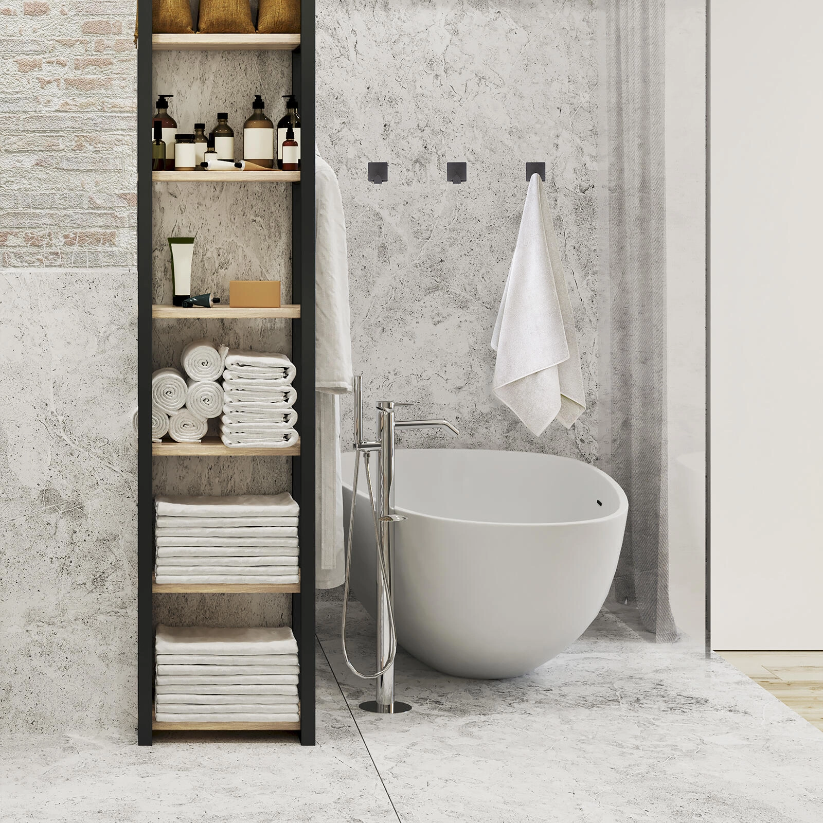 De matzwarte afwerking en het compacte formaat passen in de badkamer, keuken en hal en vullen de inrichting subtiel aan.
