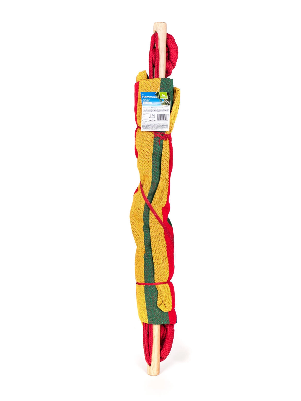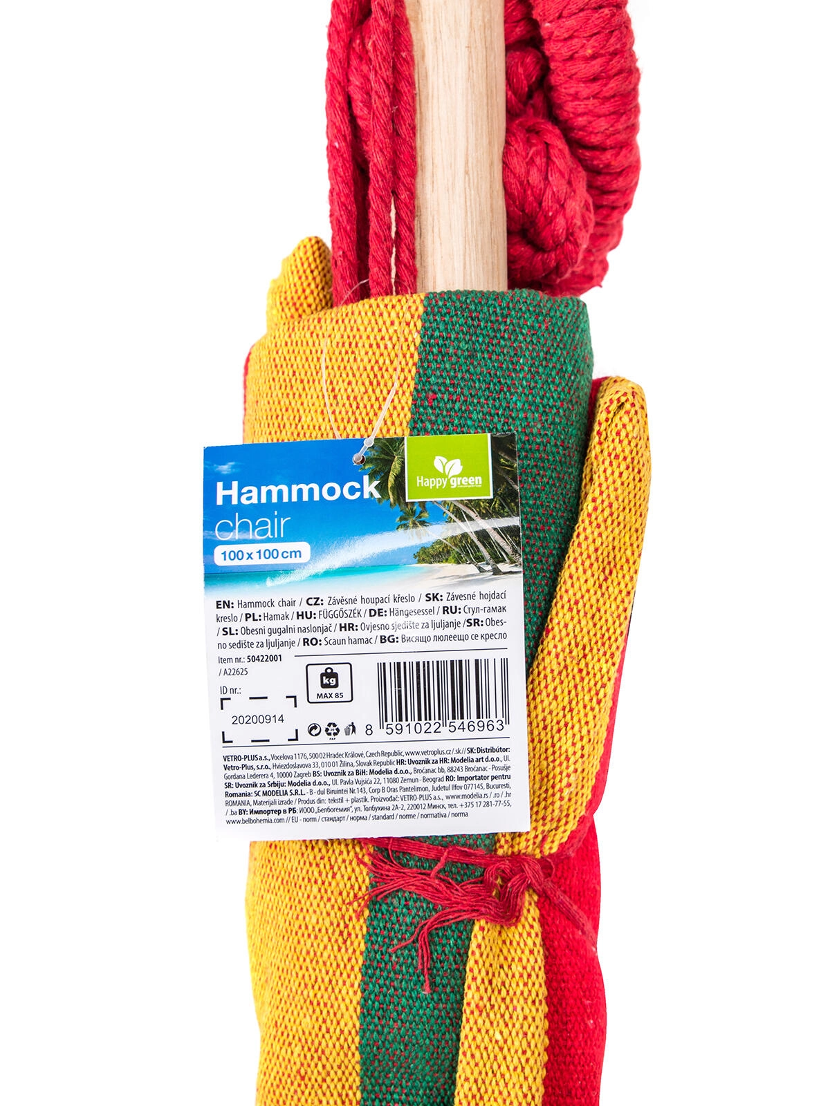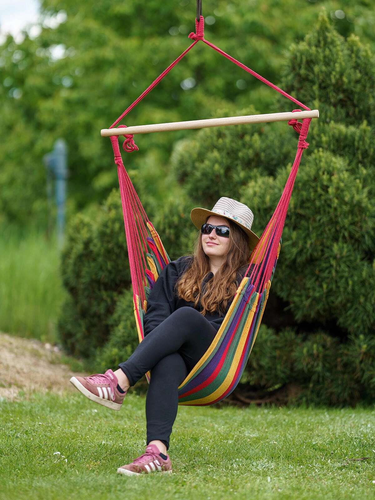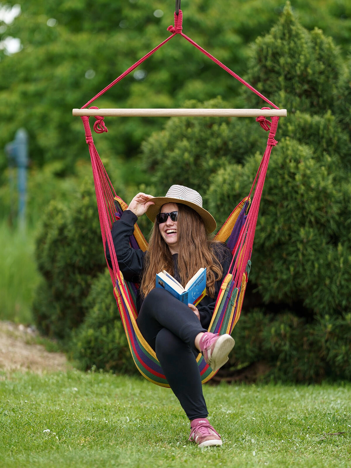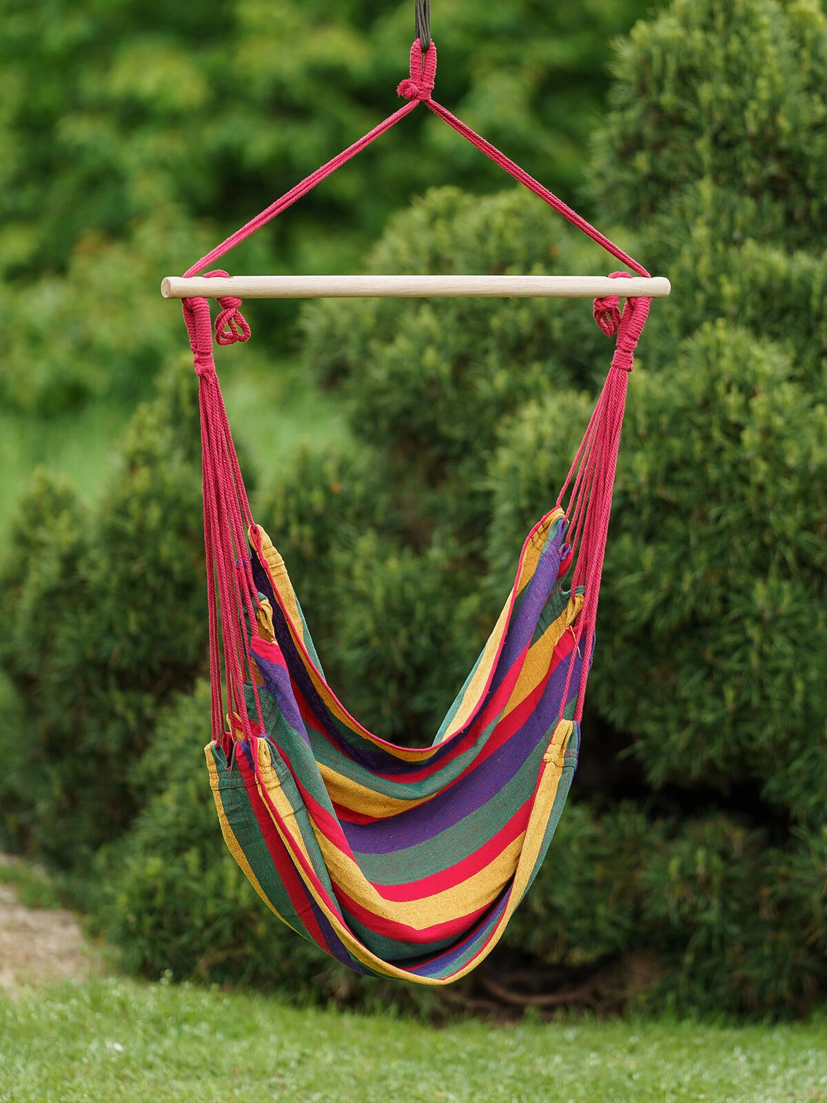 Geniet van ontspanning thuis en in de tuin met een hangende schommelstoel met éénpuntsophanging, stabiliserende houten spreidstok en kleurrijke textiel. Het compacte formaat van 100 × 100 cm en een draagvermogen van 85 kg zorgen voor comfortabel zitten op het terras, balkon en binnenshuis.