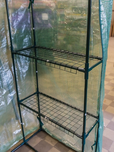 Vier niveaus draadrekken houden potten en zaaibakken overzichtelijk met goede luchtcirculatie – ideaal voor kiemen en afharden van planten.