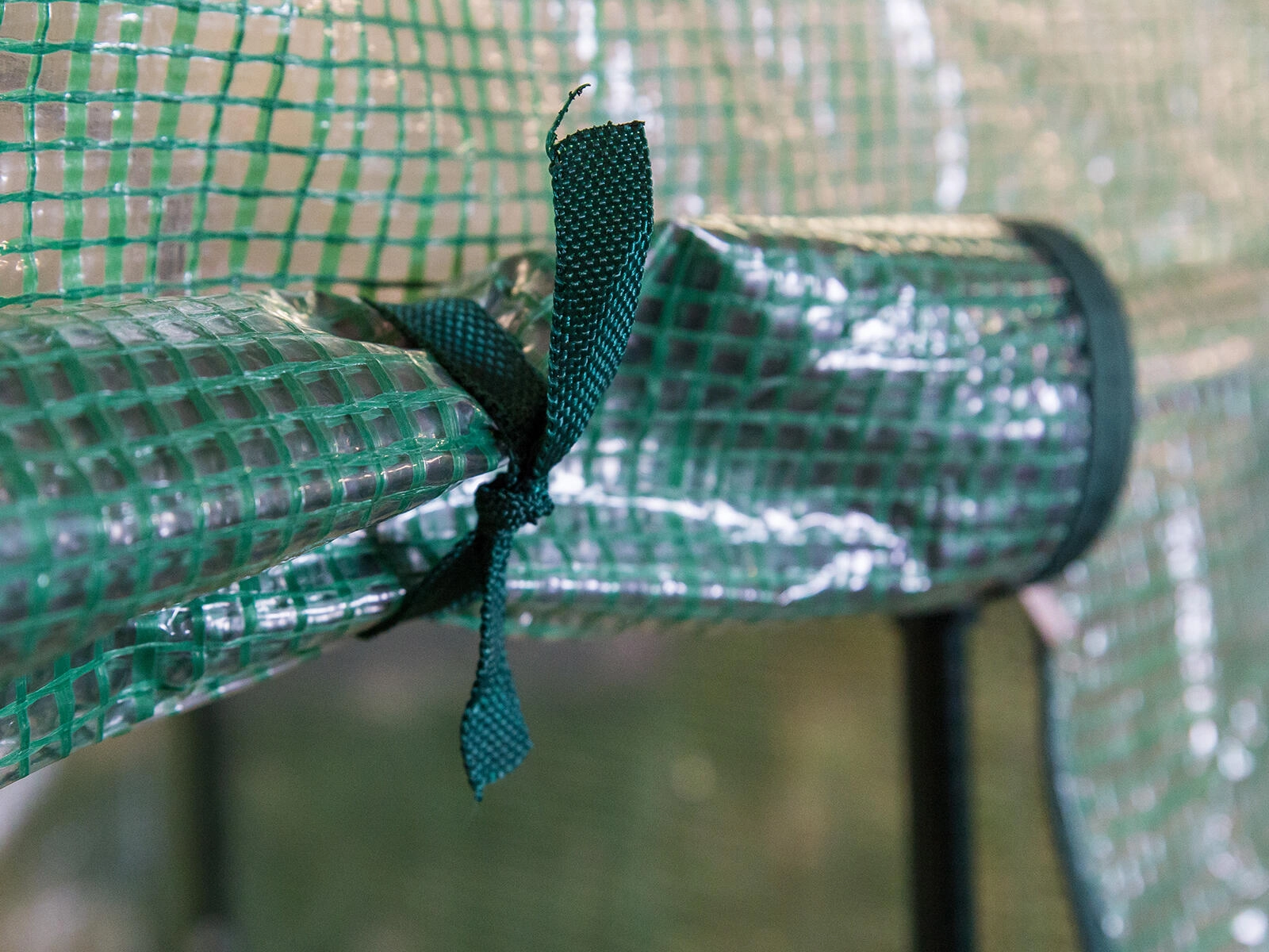 De transparant-groene folie met netversterking verhoogt de stevigheid, laat licht door en beschermt tegelijk tegen wind en regen voor stabiele groeicondities.